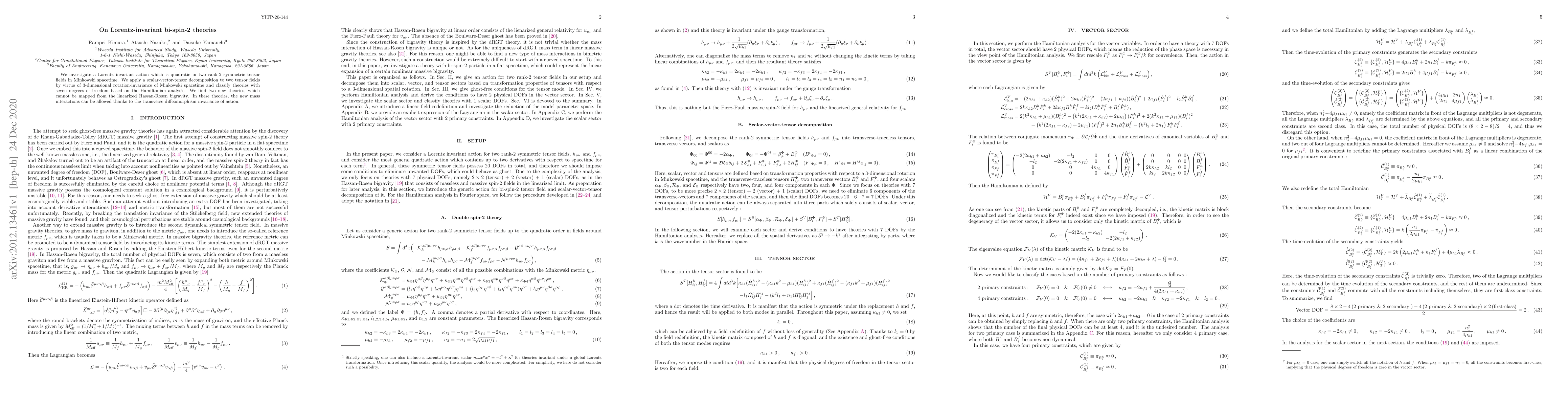 We investigate a Lorentz invariant action which is quadratic in two rank-2 symmetric tensor fields in Minkowski spacetime. We apply a scalar-vector-tensor decomposition to two tensor fields by virtue of 3-dimensional rotation-invariance of Minkowski spacetime and classify theories with seven degrees of freedom based on the Hamiltonian analysis. We find two new theories, which cannot be mapped from the linearized Hassan-Rosen bigravity. In these theories, the new mass interactions can be allowed thanks to the transverse diffeomorphism invariance of action.
