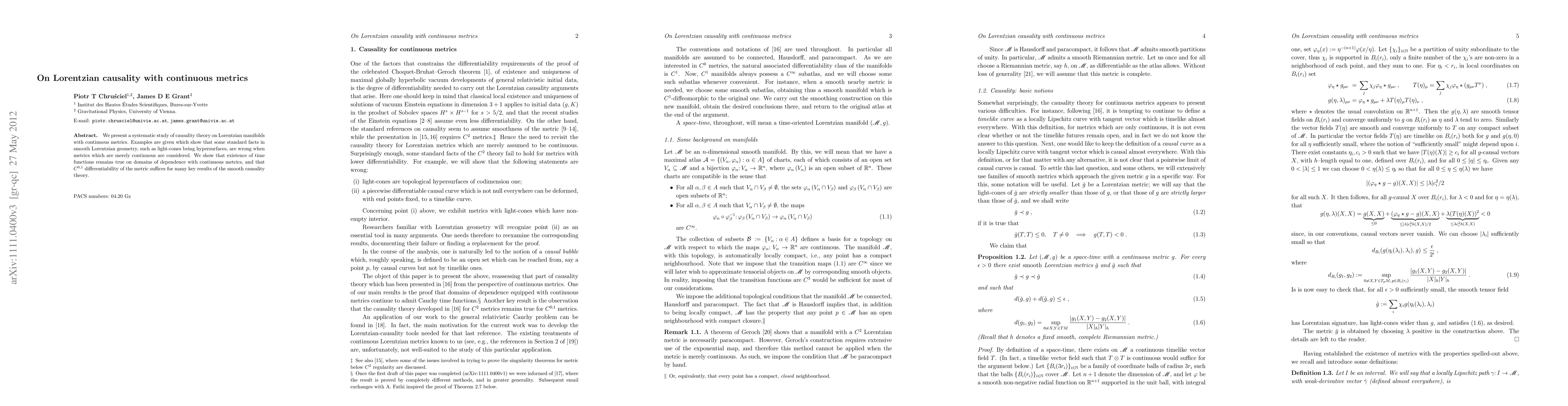 This paper investigates causality on Lorentzian manifolds with continuous metrics, demonstrating that standard smooth geometry facts, like light-cones being hypersurfaces, do not hold. It confirms that time functions still exist in domains of dependence, and that $C^{0,1}$ metric differentiability is sufficient for many smooth causality theory results.