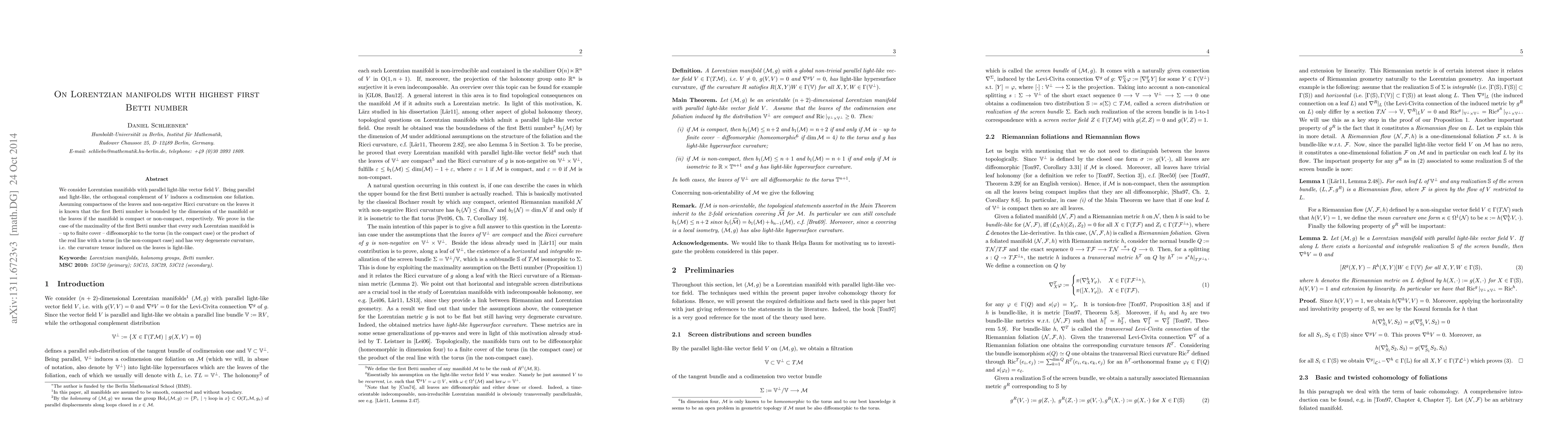 Lorentzian manifolds with parallel light-like vector fields have first Betti numbers bounded by dimension or leaf dimensions, leading to diffeomorphic structures similar to the torus or product of real line and torus.
