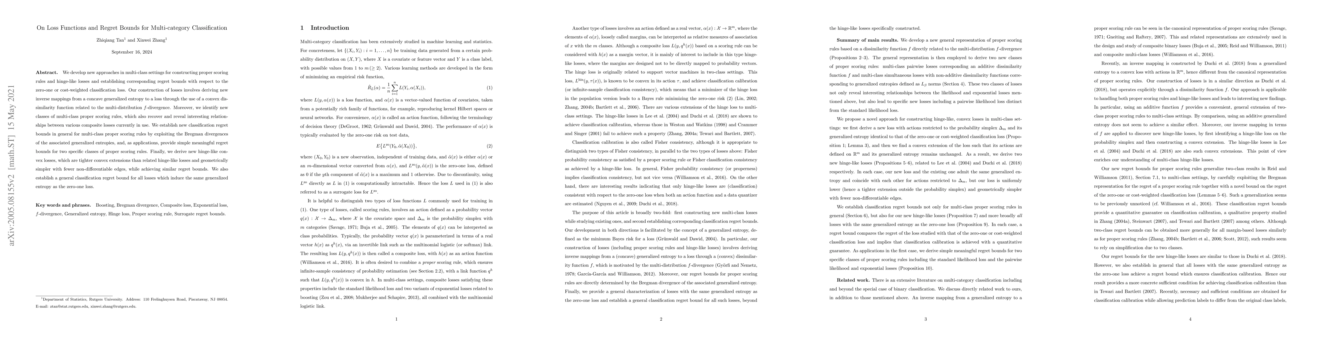 This paper develops new loss functions and regret bounds for multi-category classification, introducing proper scoring rules and hinge-like losses derived from generalized entropies. It establishes new regret bounds using Bregman divergences and provides tighter, simpler convex extensions of existing hinge-like losses.