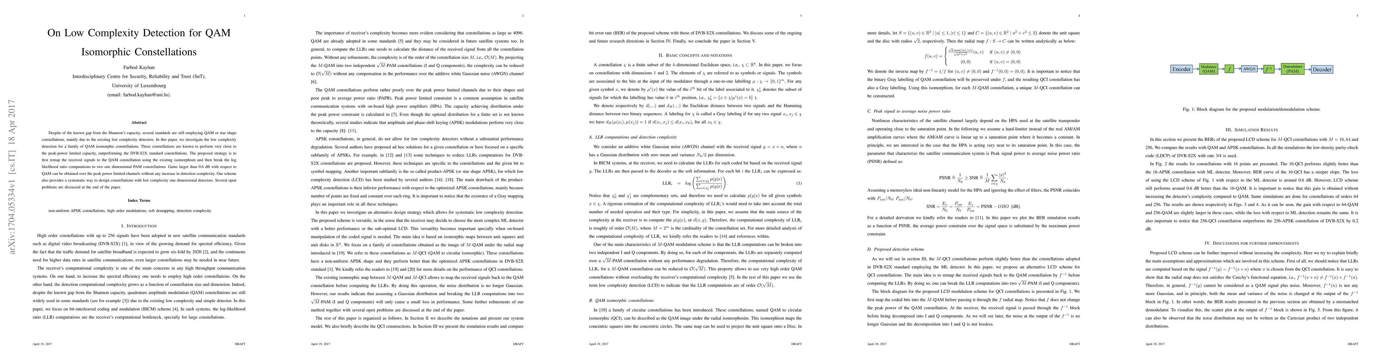 Despite of the known gap from the Shannon's capacity, several standards are still employing QAM or star shape constellations, mainly due to the existing low complexity detectors. In this paper, we investigate the low complexity detection for a family of QAM isomorphic constellations. These constellations are known to perform very close to the peak-power limited capacity, outperforming the DVB-S2X standard constellations. The proposed strategy is to first remap the received signals to the QAM constellation using the existing isomorphism and then break the log likelihood ratio computations to two one dimensional PAM constellations. Gains larger than 0.6 dB with respect to QAM can be obtained over the peak power limited channels without any increase in detection complexity. Our scheme also provides a systematic way to design constellations with low complexity one dimensional detectors. Several open problems are discussed at the end of the paper.