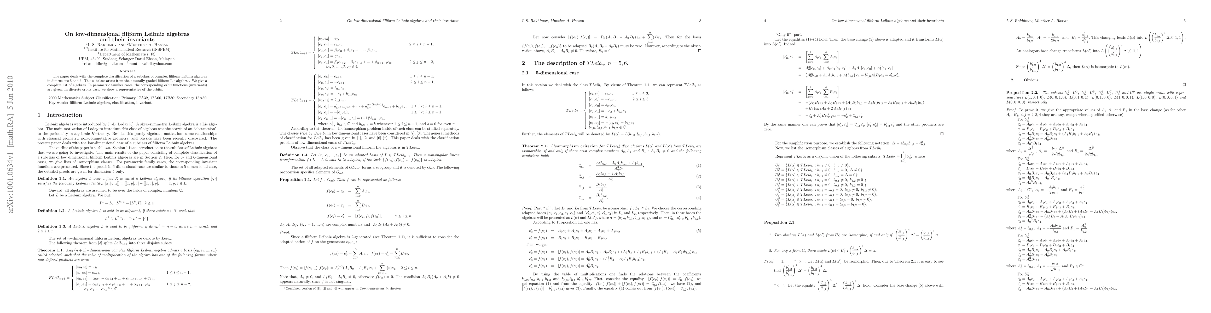 The paper deals with the complete classification of a subclass of complex filiform Leibniz algebras in dimensions 5 and 6. This subclass arises from the naturally graded filiform Lie algebras. We give a complete list of algebras. In parametric families cases, the corresponding orbit functions (invariants) are given. In discrete orbits case, we show a representative of the orbits.