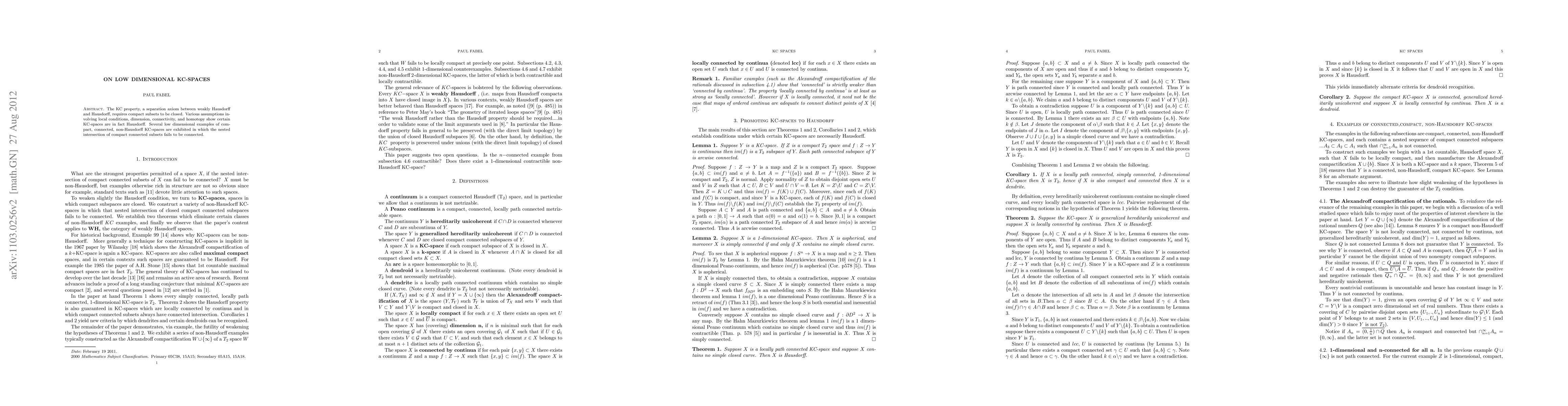 This paper explores KC-spaces, a separation axiom between weakly Hausdorff and Hausdorff, focusing on low-dimensional examples where compact subsets are closed. It demonstrates that certain KC-spaces are Hausdorff under specific local conditions, but also presents compact, connected, non-Hausdorff KC-spaces where the nested intersection of compact connected subsets is not connected.