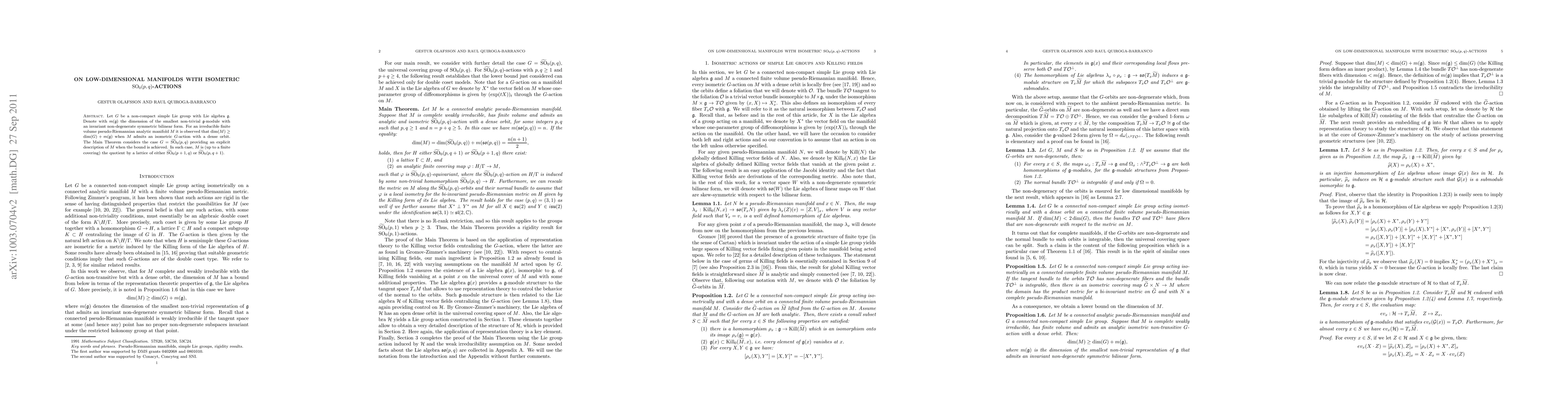 This paper explores the dimension of low-dimensional manifolds under isometric actions of the non-compact simple Lie group $\widetilde{\mathrm{SO}}_0(p,q)$. It establishes a lower bound for the dimension of such manifolds and provides an explicit description of the manifold when this bound is achieved, showing it is a quotient by a lattice of either $\widetilde{\mathrm{SO}}_0(p+1,q)$ or $\widetilde{\mathrm{SO}}_0(p,q+1)$.