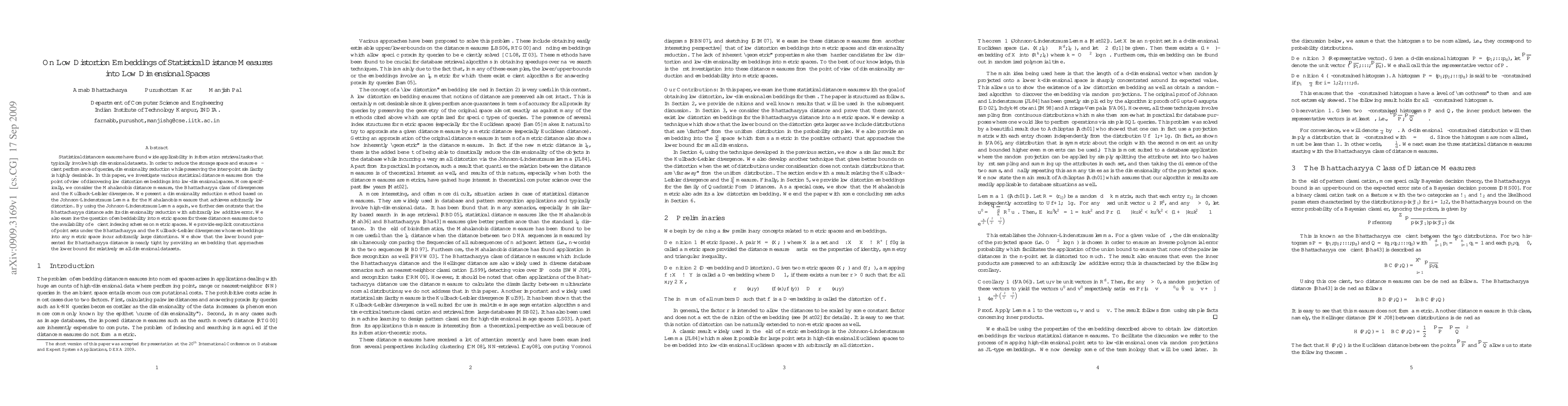 This paper explores low distortion embeddings of statistical distance measures, including Mahalanobis, Bhattacharyya, and Kullback-Leibler divergences, into low-dimensional spaces to enhance query efficiency in high-dimensional datasets. It utilizes the Johnson-Lindenstrauss Lemma to achieve low distortion for Mahalanobis and Bhattacharyya distances, while also examining the embeddability of these measures into metric spaces.