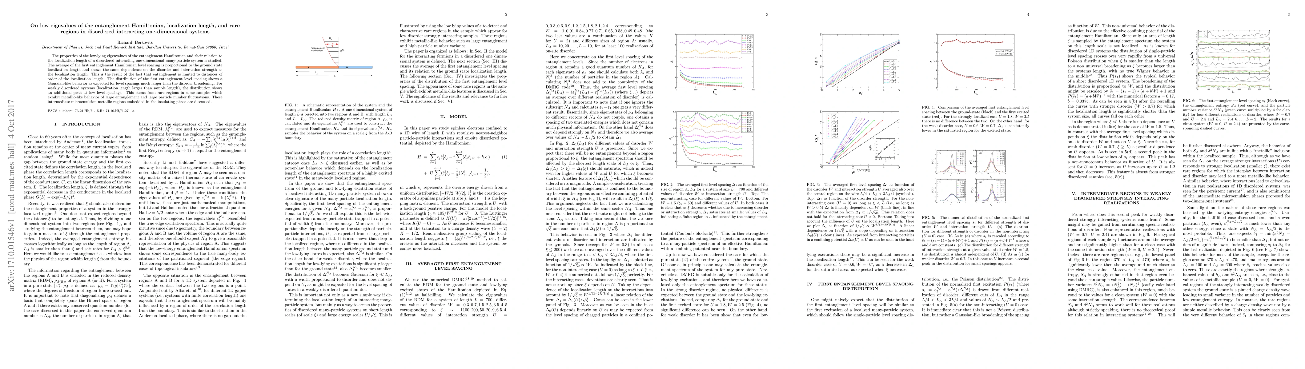 The properties of the low-lying eigenvalues of the entanglement Hamiltonian and their relation to the localization length of disordered interacting one-dimensional many-particle system is studied. The average of the first entanglement Hamiltonian level spacing is proportional to the ground state localization length and shows the same dependence on the disorder and interaction strength as the localization length. This is the result of the fact that entanglement is limited to distances of order of the localization length. The distribution of the first entanglement level spacing shows a Gaussian-like behavior as expected for level spacings much larger than the disorder broadening. For weakly disordered systems (localization length larger than sample length), the distribution shows an additional peak at low level spacings. This stems from rare regions in some samples which exhibit metallic-like behavior of large entanglement and large particle number fluctuations. These intermediate 'microemulsion' metallic regions embedded in the insulating phase are discussed.