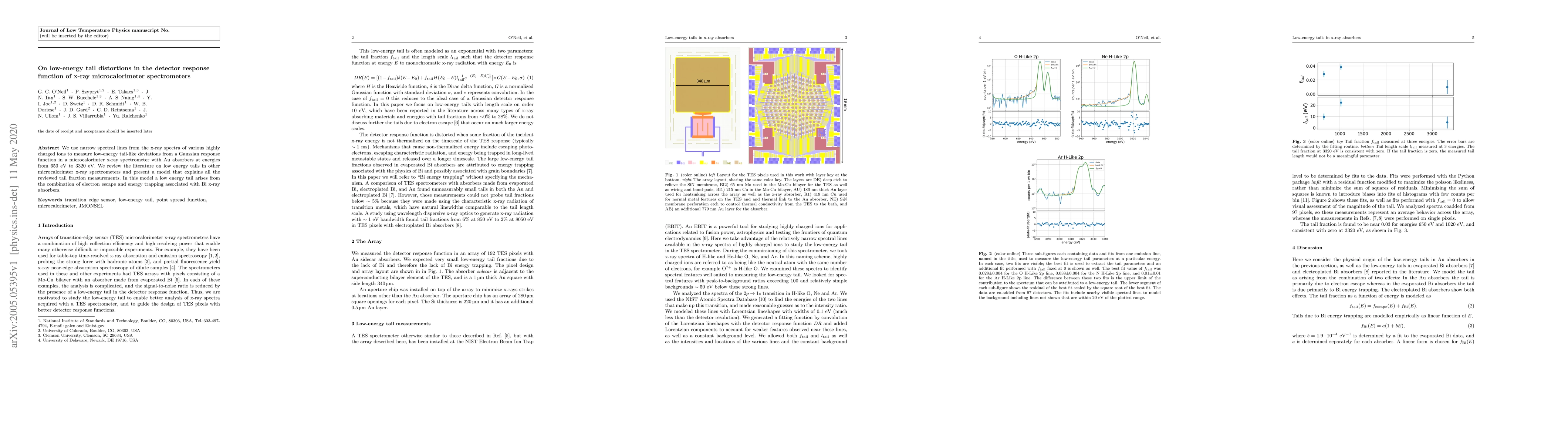 This study investigates low-energy tail distortions in the detector response function of x-ray microcalorimeter spectrometers using narrow spectral lines from highly charged ions. The research proposes a model explaining these tails, attributing them to electron escape and energy trapping in Bi x-ray absorbers.