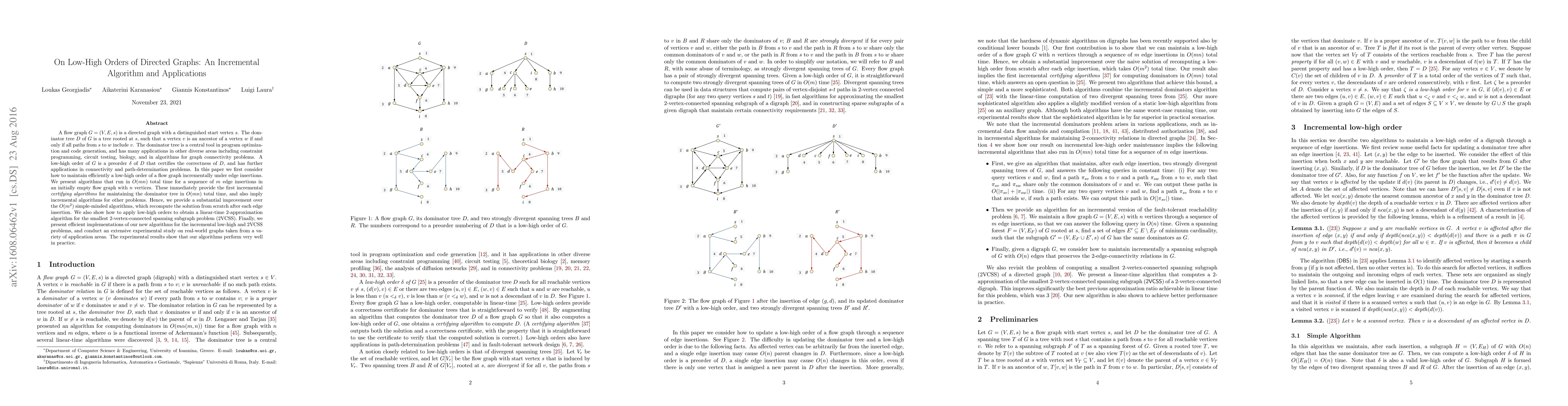 A flow graph $G=(V,E,s)$ is a directed graph with a distinguished start vertex $s$. The dominator tree $D$ of $G$ is a tree rooted at $s$, such that a vertex $v$ is an ancestor of a vertex $w$ if and only if all paths from $s$ to $w$ include $v$. The dominator tree is a central tool in program optimization and code generation and has many applications in other diverse areas including constraint programming, circuit testing, biology, and in algorithms for graph connectivity problems. A low-high order of $G$ is a preorder $\delta$ of $D$ that certifies the correctness of $D$ and has further applications in connectivity and path-determination problems. In this paper, we first consider how to maintain efficiently a low-high order of a flow graph incrementally under edge insertions. We present algorithms that run in $O(mn)$ total time for a sequence of $m$ edge insertions in an initially empty flow graph with $n$ vertices.These immediately provide the first incremental certifying algorithms for maintaining the dominator tree in $O(mn)$ total time, and also imply incremental algorithms for other problems. Hence, we provide a substantial improvement over the $O(m^2)$ simple-minded algorithms, which recompute the solution from scratch after each edge insertion. We also show how to apply low-high orders to obtain a linear-time $2$-approximation algorithm for the smallest $2$-vertex-connected spanning subgraph problem (2VCSS). Finally, we present efficient implementations of our new algorithms for the incremental low-high and 2VCSS problems and conduct an extensive experimental study on real-world graphs taken from a variety of application areas. The experimental results show that our algorithms perform very well in practice.