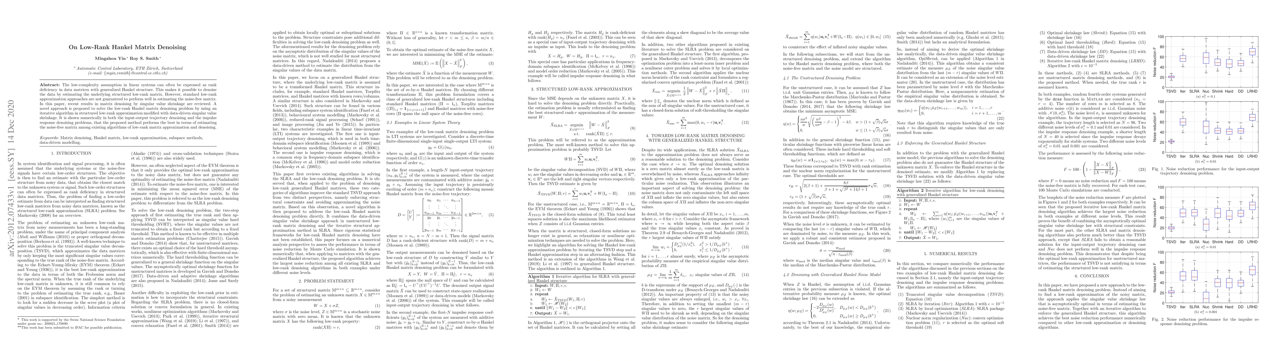 This paper proposes a novel iterative algorithm for denoising low-rank Hankel matrices using structured low-rank approximation combined with data-driven singular value shrinkage. The method outperforms existing low-rank approximation techniques in estimating noise-free matrices in both input-output trajectory and impulse response denoising scenarios.