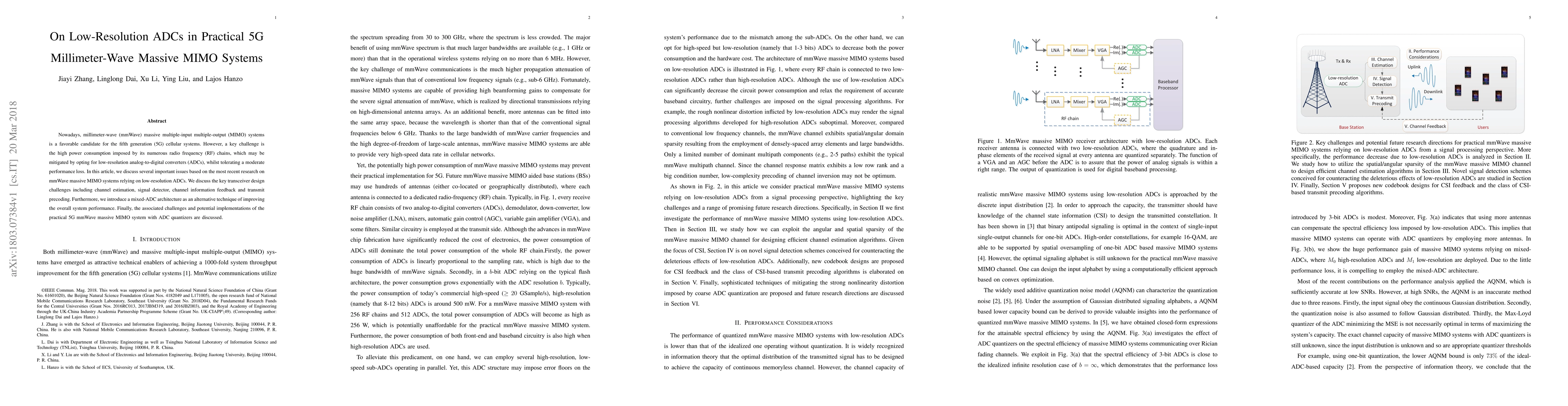 This paper discusses the use of low-resolution ADCs in 5G millimeter-wave massive MIMO systems to reduce power consumption, addressing challenges in transceiver design, and introduces mixed-ADC architecture to enhance system performance. It also explores practical implementation issues and potential solutions.
