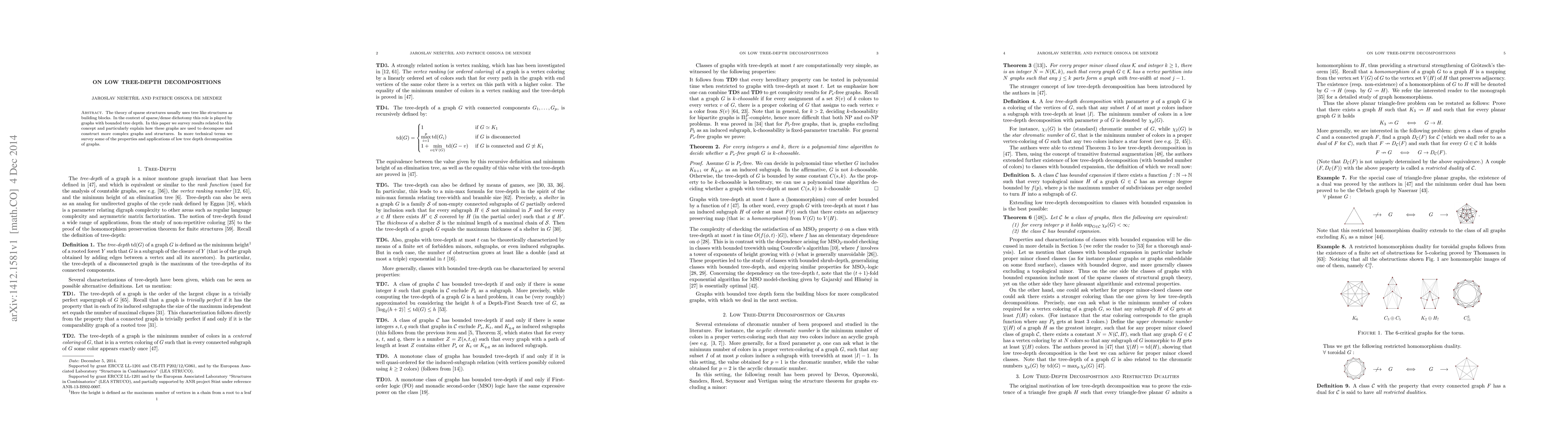 This paper surveys results on low tree-depth decompositions in sparse graph theory, focusing on how graphs with bounded tree depth are utilized to decompose and construct complex graphs and structures. It highlights properties and applications of these decompositions.