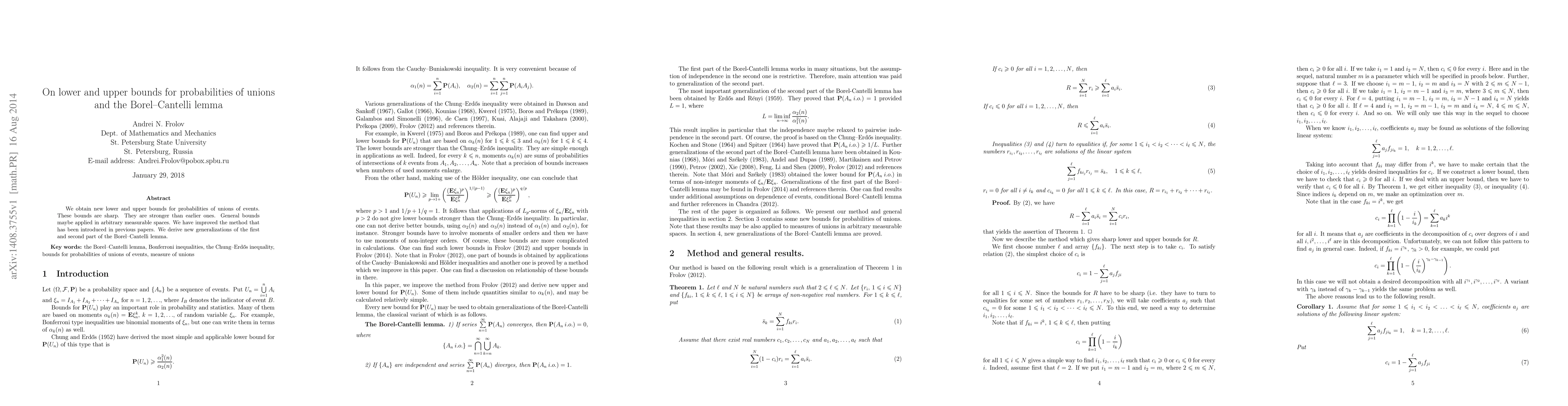 This paper presents sharp, improved lower and upper bounds for probabilities of unions of events in arbitrary measurable spaces, surpassing previous methods. It also derives new generalizations of the first and second Borel-Cantelli lemmas.