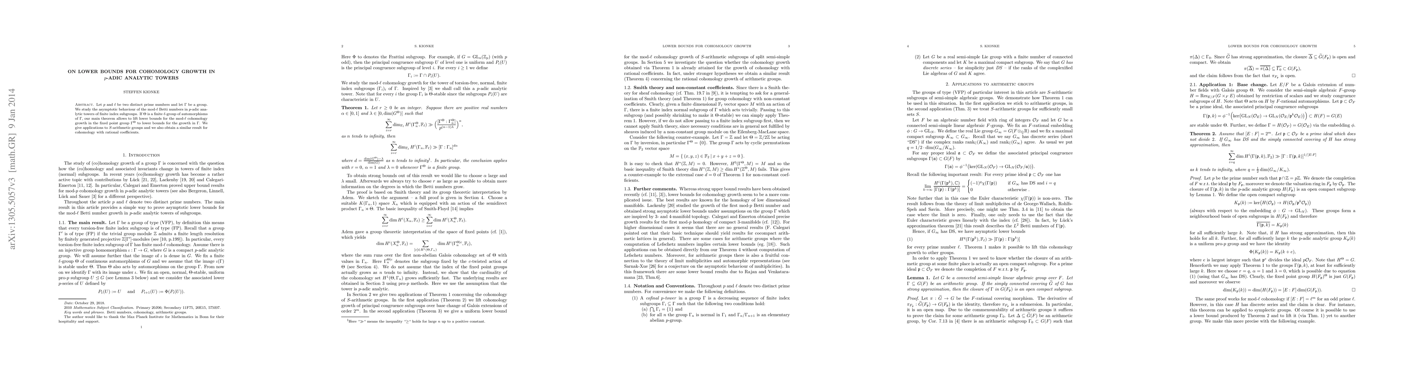 This paper investigates the asymptotic behavior of mod-l Betti numbers in p-adic analytic towers of finite index subgroups, establishing a method to lift lower bounds for cohomology growth in fixed point groups to the entire group. Applications are provided for S-arithmetic groups and a parallel result is obtained for cohomology with rational coefficients.