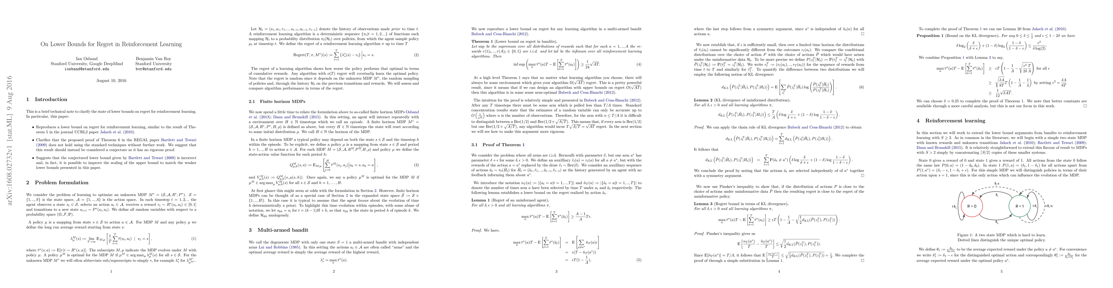 This is a brief technical note to clarify the state of lower bounds on regret for reinforcement learning. In particular, this paper: - Reproduces a lower bound on regret for reinforcement learning, similar to the result of Theorem 5 in the journal UCRL2 paper (Jaksch et al 2010). - Clarifies that the proposed proof of Theorem 6 in the REGAL paper (Bartlett and Tewari 2009) does not hold using the standard techniques without further work. We suggest that this result should instead be considered a conjecture as it has no rigorous proof. - Suggests that the conjectured lower bound given by (Bartlett and Tewari 2009) is incorrect and, in fact, it is possible to improve the scaling of the upper bound to match the weaker lower bounds presented in this paper. We hope that this note serves to clarify existing results in the field of reinforcement learning and provides interesting motivation for future work.