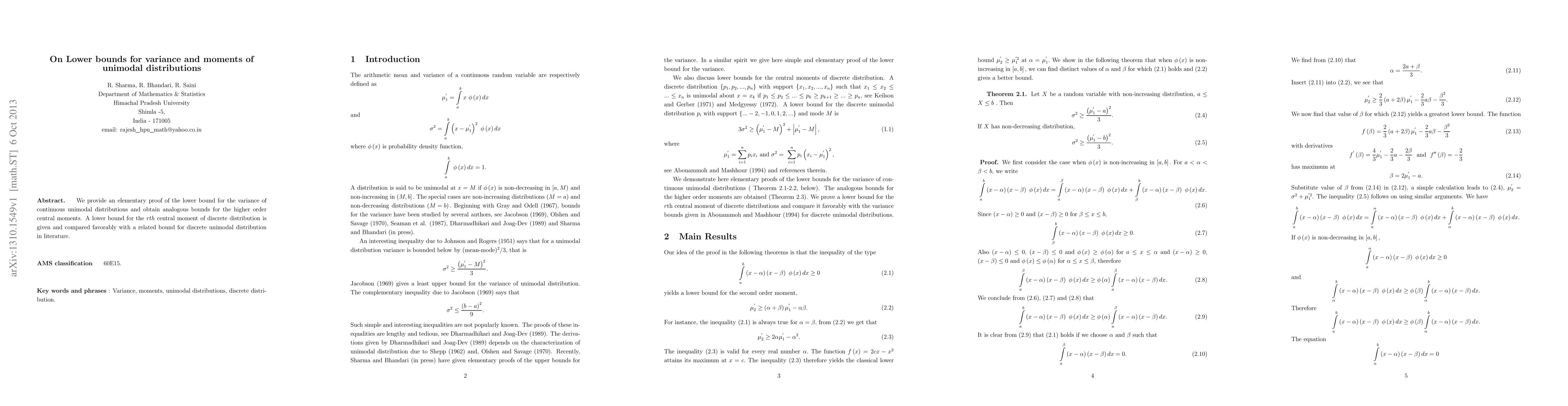 We provide an elementary proof of the lower bound for the variance of continuous unimodal distributions and obtain analogous bounds for the higher order central moments. A lower bound for the rth central moment of discrete distribution is given and compared favorably with a related bound for discrete unimodal distribution in literature.