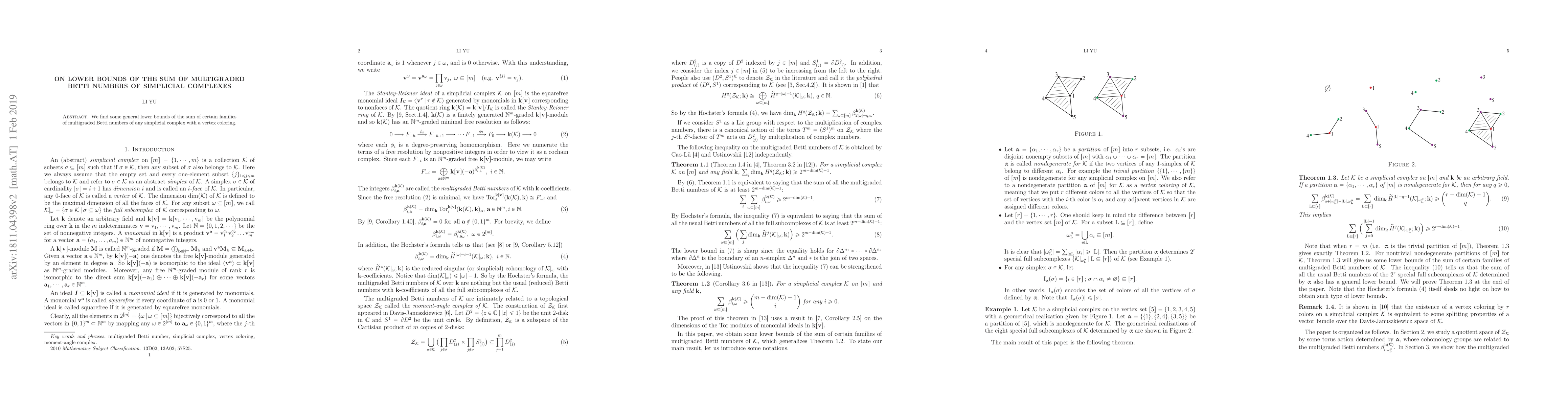 Summary: This paper establishes general lower bounds for the sum of specific multigraded Betti numbers in simplicial complexes, leveraging vertex coloring to provide insights into their algebraic structures. The findings contribute to understanding the combinatorial topology of these complexes.