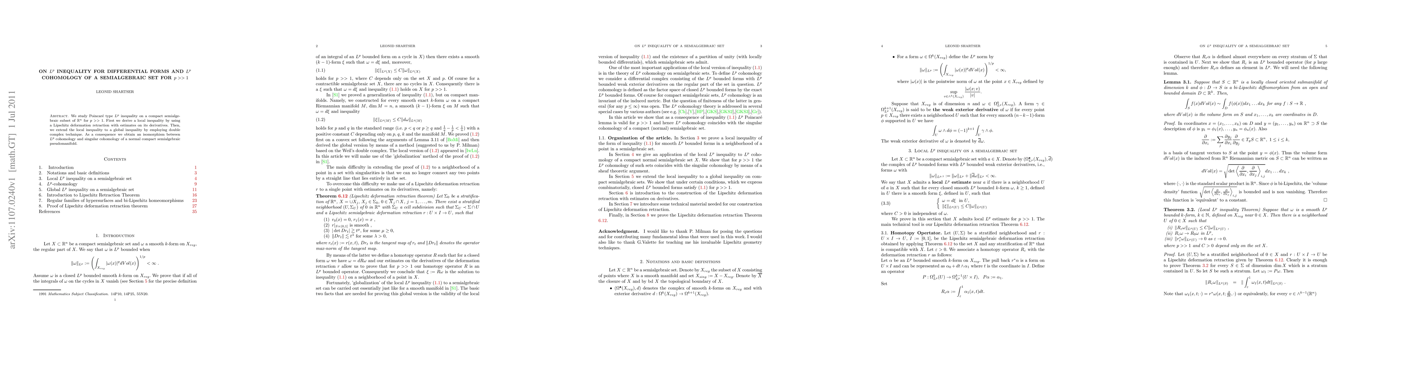 We study Poincar\'e type $L^p$ inequality on a compact semialgebraic subset of $\R^n$ for $p>>1$. First we derive a local inequality by using a Lipschitz deformation retraction with estimates on its derivatives. Then, we extend the local inequality to a global inequality by employing double complex technique. As a consequence we obtain an isomorphism between $L^p$ cohomology and singular cohomology of a normal compact semialgebraic pseudomanifold.