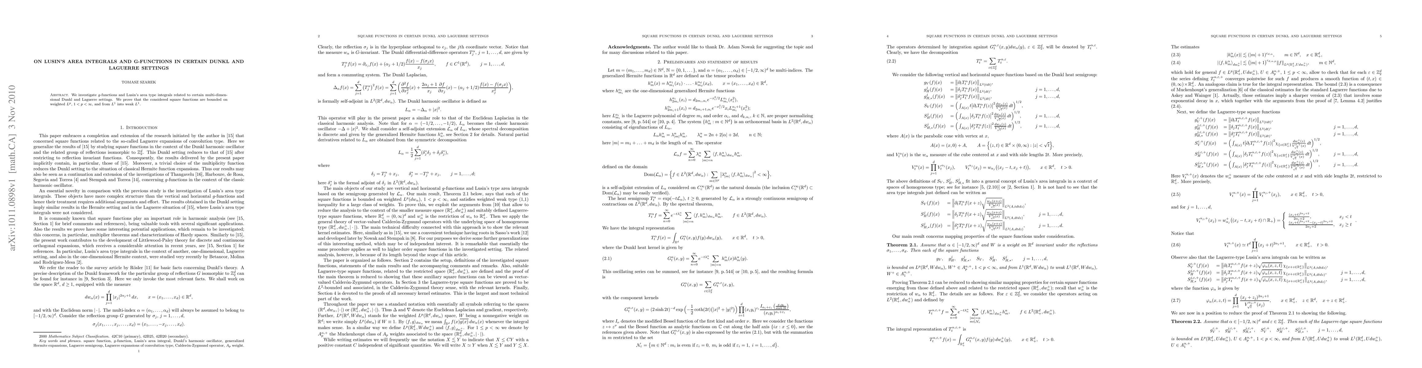 This paper explores $g$-functions and Lusin's area integrals in multi-dimensional Dunkl and Laguerre settings, proving that the associated square functions are bounded on weighted $L^p$ spaces for $1 < p < \infty$ and from $L^1$ to weak $L^1$.