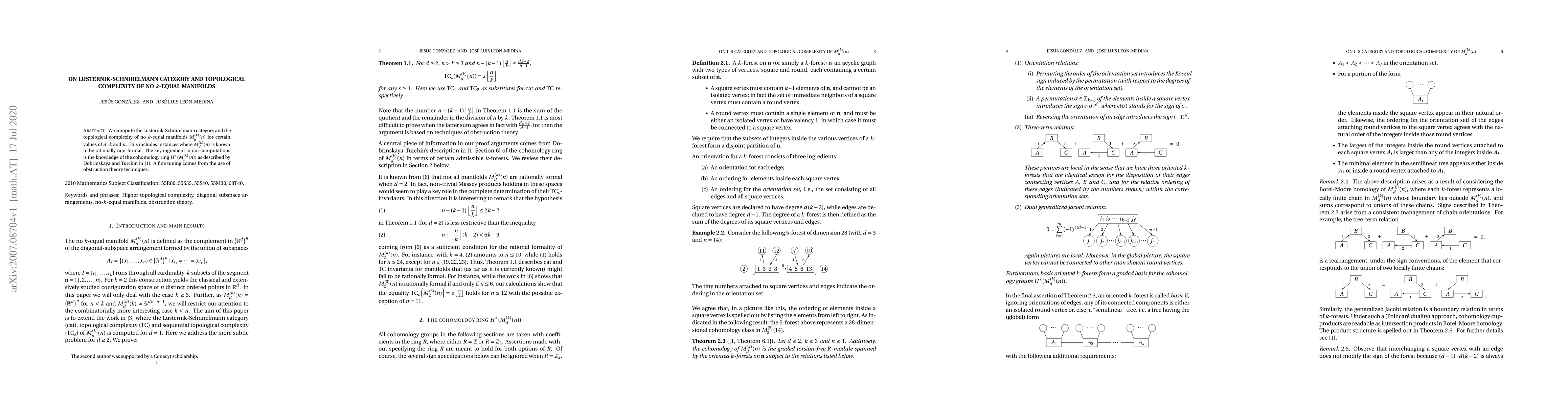 We compute the Lusternik-Schnirelmann category and the topological complexity of no $k$-equal manifolds $M^{(k)}_d(n)$ for certain values of $d$, $k$ and $n$. This includes instances where $M^{(k)}_d(n)$ is known to be rationally non-formal. The key ingredient in our computations is the knowledge of the cohomology ring $H^*(M^{(k)}_d(n))$ as described by Dobrinskaya and Turchin. A fine tuning comes from the use of obstruction theory techniques.