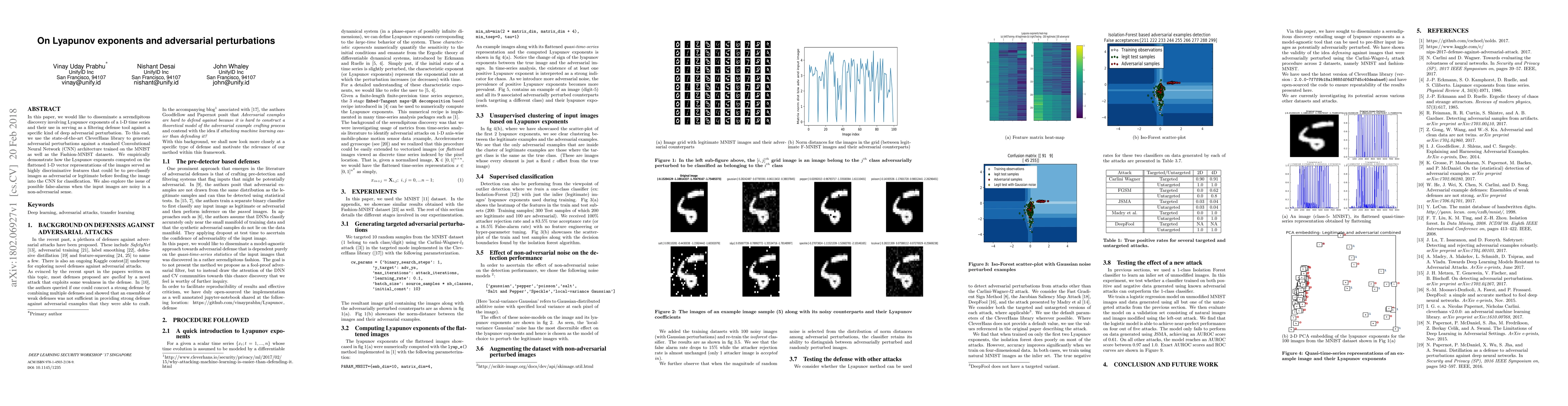 In this paper, we would like to disseminate a serendipitous discovery involving Lyapunov exponents of a 1-D time series and their use in serving as a filtering defense tool against a specific kind of deep adversarial perturbation. To this end, we use the state-of-the-art CleverHans library to generate adversarial perturbations against a standard Convolutional Neural Network (CNN) architecture trained on the MNIST as well as the Fashion-MNIST datasets. We empirically demonstrate how the Lyapunov exponents computed on the flattened 1-D vector representations of the images served as highly discriminative features that could be to pre-classify images as adversarial or legitimate before feeding the image into the CNN for classification. We also explore the issue of possible false-alarms when the input images are noisy in a non-adversarial sense.