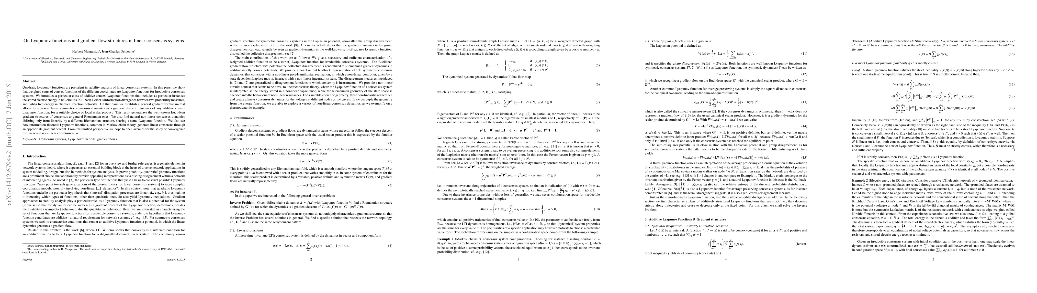 This paper explores Lyapunov functions for linear consensus systems, demonstrating that weighted sums of convex functions serve as such for irreducible systems. It introduces a class of additive convex Lyapunov functions, including stored energy and information divergence, and establishes a general gradient formalism to represent consensus dynamics as gradient descent, extending beyond Euclidean to Riemannian structures.