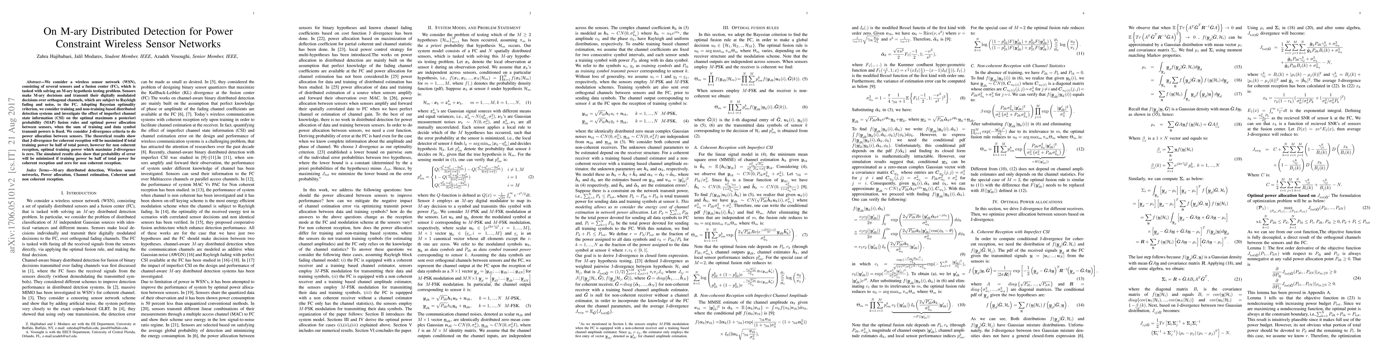 This paper investigates power constraint wireless sensor networks with M-ary hypothesis testing, focusing on optimal power allocation and error minimization under different reception conditions. It finds that training power should be half of total power for coherent reception and zero for non-coherent reception to minimize probability of error.