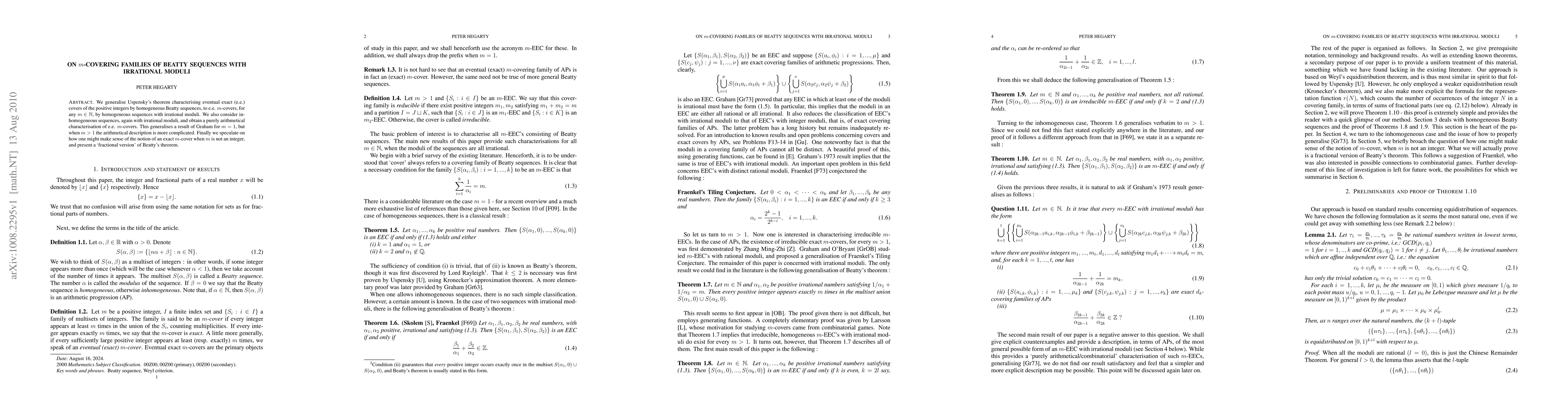 We generalise Uspensky's theorem characterising eventual exact (e.e.) covers of the positive integers by homogeneous Beatty sequences, to e.e. m-covers, for any m \in \N, by homogeneous sequences with irrational moduli. We also consider inhomogeneous sequences, again with irrational moduli, and obtain a purely arithmetical characterisation of e.e. m-covers. This generalises a result of Graham for m = 1, but when m > 1 the arithmetical description is more complicated. Finally we speculate on how one might make sense of the notion of an exact m-cover when m is not an integer, and present a "fractional version" of Beatty's theorem.