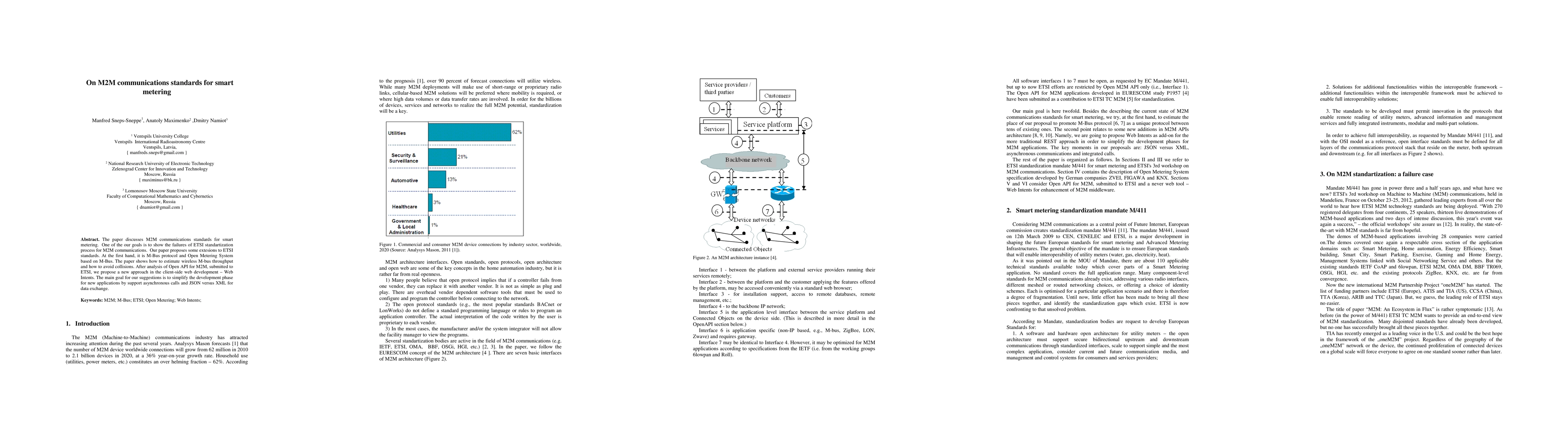 This paper critiques the ETSI standardization process for M2M communications in smart metering and proposes enhancements, including the M-Bus protocol and Open Metering System. It introduces methods for estimating wireless M-Bus throughput and collision avoidance, and suggests Web Intents for client-side web development over traditional APIs to simplify application development with asynchronous calls and JSON data exchange.