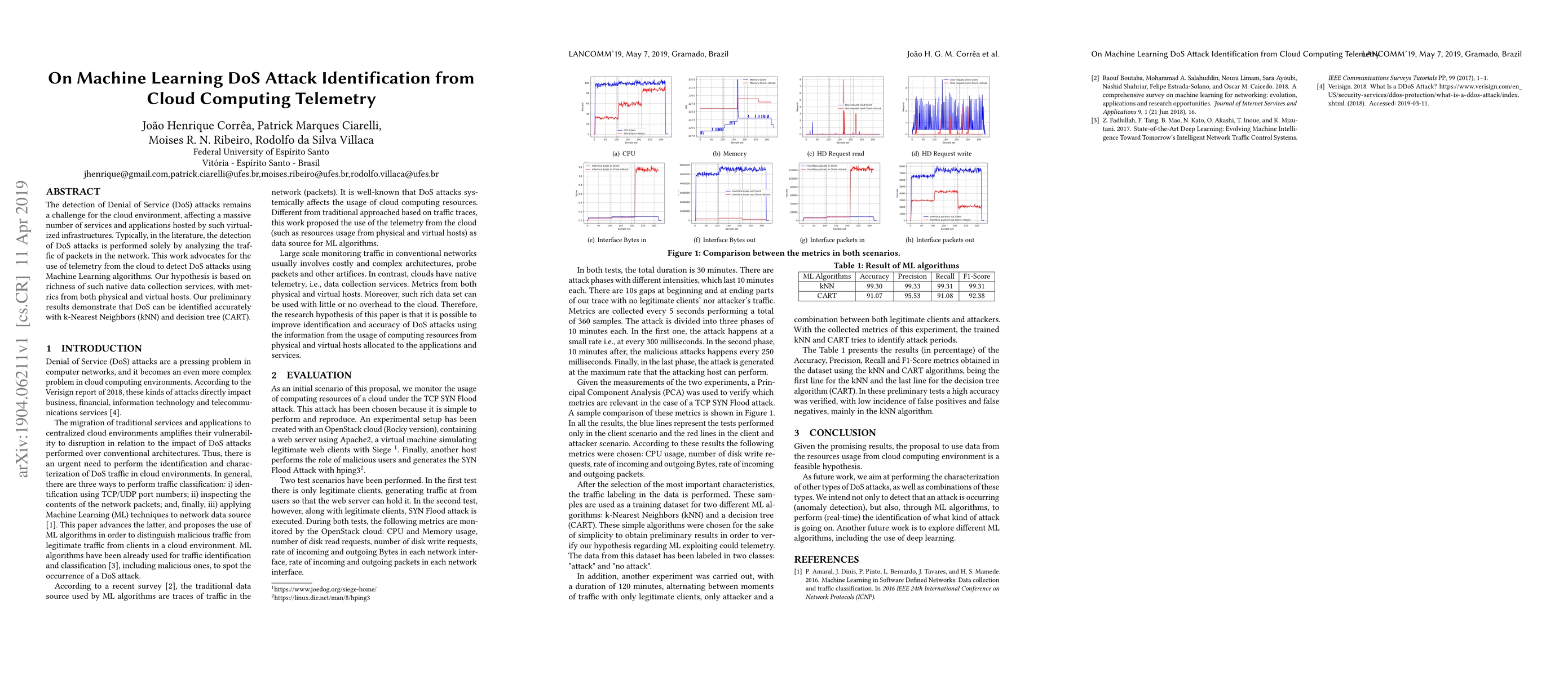The detection of Denial of Service (DoS) attacks remains a challenge for the cloud environment, affecting a massive number of services and applications hosted by such virtualized infrastructures. Typically, in the literature, the detection of DoS attacks is performed solely by analyzing the traffic of packets in the network. This work advocates for the use of telemetry from the cloud to detect DoS attacks using Machine Learning algorithms. Our hypothesis is based on richness of such native data collection services, with metrics from both physical and virtual hosts. Our preliminary results demonstrate that DoS can be identified accurately with k-Nearest Neighbors (kNN) and decision tree (CART).