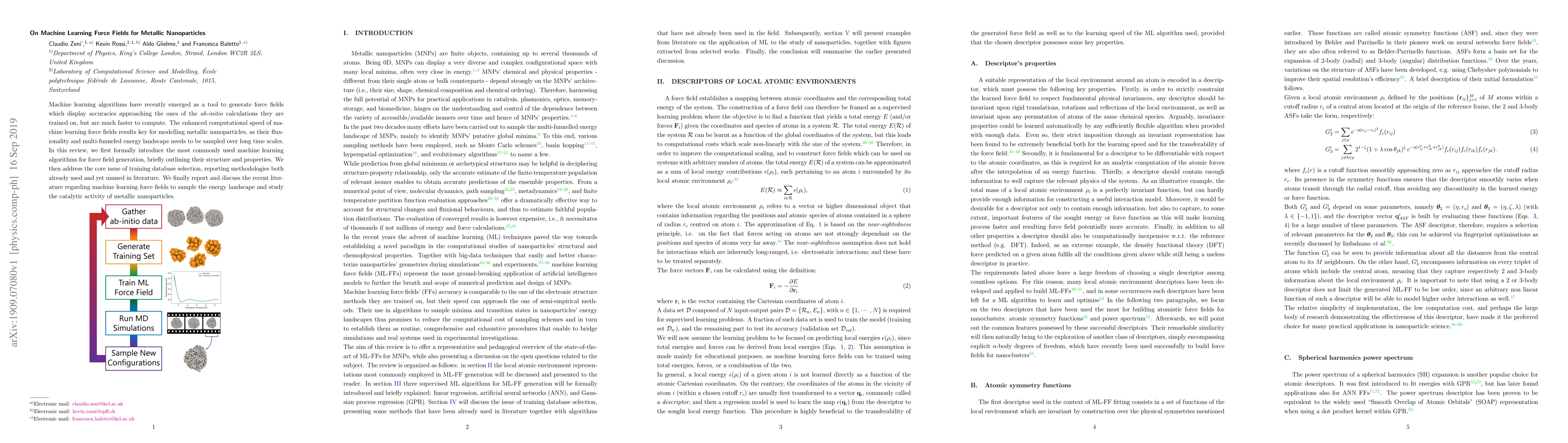 Machine learning algorithms have recently emerged as a tool to generate force fields which display accuracies approaching the ones of the ab-initio calculations they are trained on, but are much faster to compute. The enhanced computational speed of machine learning force fields results key for modelling metallic nanoparticles, as their fluxionality and multi-funneled energy landscape needs to be sampled over long time scales. In this review, we first formally introduce the most commonly used machine learning algorithms for force field generation, briefly outlining their structure and properties. We then address the core issue of training database selection, reporting methodologies both already used and yet unused in literature. We finally report and discuss the recent literature regarding machine learning force fields to sample the energy landscape and study the catalytic activity of metallic nanoparticles.