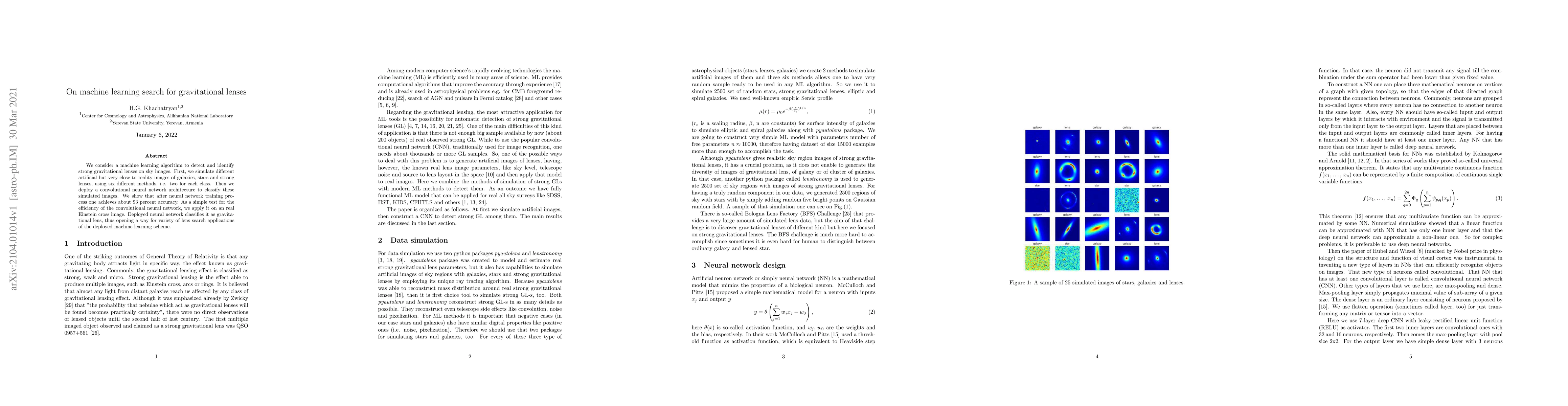 We consider a machine learning algorithm to detect and identify strong gravitational lenses on sky images. First, we simulate different artificial but very close to reality images of galaxies, stars and strong lenses, using six different methods, i.e. two for each class. Then we deploy a convolutional neural network architecture to classify these simulated images. We show that after neural network training process one achieves about 93 percent accuracy. As a simple test for the efficiency of the convolutional neural network, we apply it on an real Einstein cross image. Deployed neural network classifies it as gravitational lens, thus opening a way for variety of lens search applications of the deployed machine learning scheme.