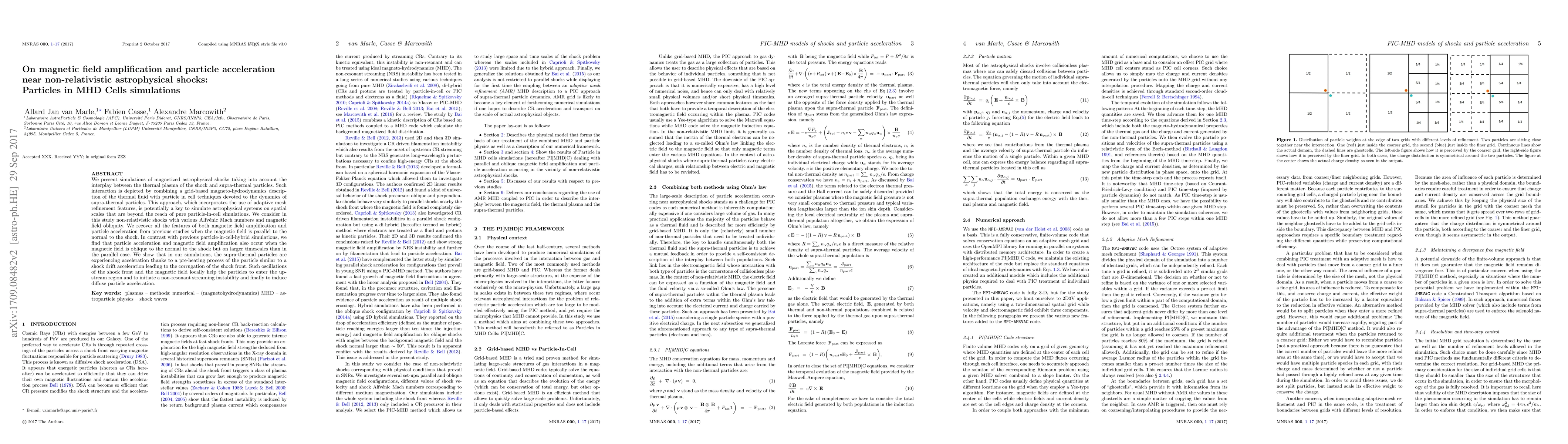 We present simulations of magnetized astrophysical shocks taking into account the interplay between the thermal plasma of the shock and supra-thermal particles. Such interaction is depicted by combining a grid-based magneto-hydrodynamics description of the thermal fluid with particle in cell techniques devoted to the dynamics of supra-thermal particles. This approach, which incorporates the use of adaptive mesh refinement features, is potentially a key to simulate astrophysical systems on spatial scales that are beyond the reach of pure particle-in-cell simulations. We consider in this study non-relativistic shocks with various Alfvenic Mach numbers and magnetic field obliquity. We recover all the features of both magnetic field amplification and particle acceleration from previous studies when the magnetic field is parallel to the normal to the shock. In contrast with previous particle-in-cell-hybrid simulations, we find that particle acceleration and magnetic field amplification also occur when the magnetic field is oblique to the normal to the shock but on larger timescales than in the parallel case. We show that in our simulations, the supra-thermal particles are experiencing acceleration thanks to a pre-heating process of the particle similar to a shock drift acceleration leading to the corrugation of the shock front. Such oscillations of the shock front and the magnetic field locally help the particles to enter the upstream region and to initiate a non-resonant streaming instability and finally to induce diffuse particle acceleration.