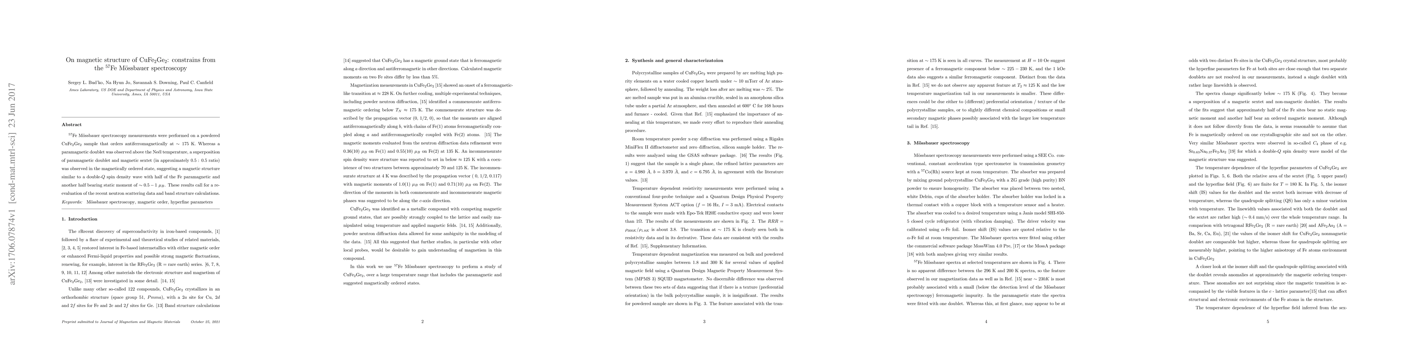 Summary: 57Fe Mossbauer spectroscopy on CuFe2Ge2 reveals an antiferromagnetic ordering at ~175 K, with a magnetic structure suggesting a double-Q spin density wave where half the Fe atoms remain paramagnetic while the other half exhibit a static moment. This challenges existing neutron scattering and band structure analyses.