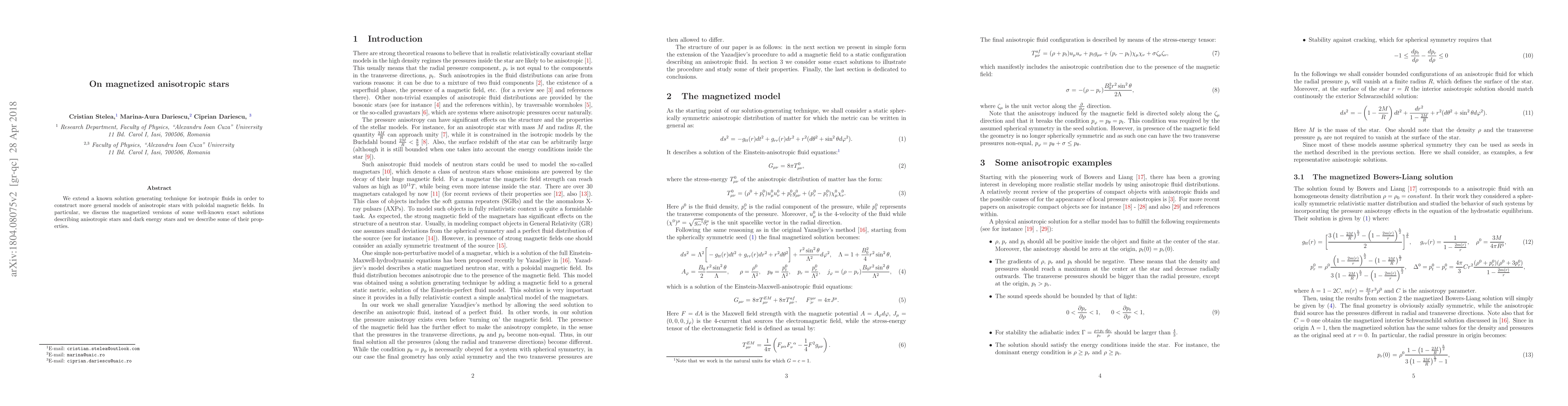 This paper extends a solution technique for isotropic fluids to create anisotropic star models with poloidal magnetic fields, discussing properties of magnetized versions of known exact solutions for anisotropic and dark energy stars.