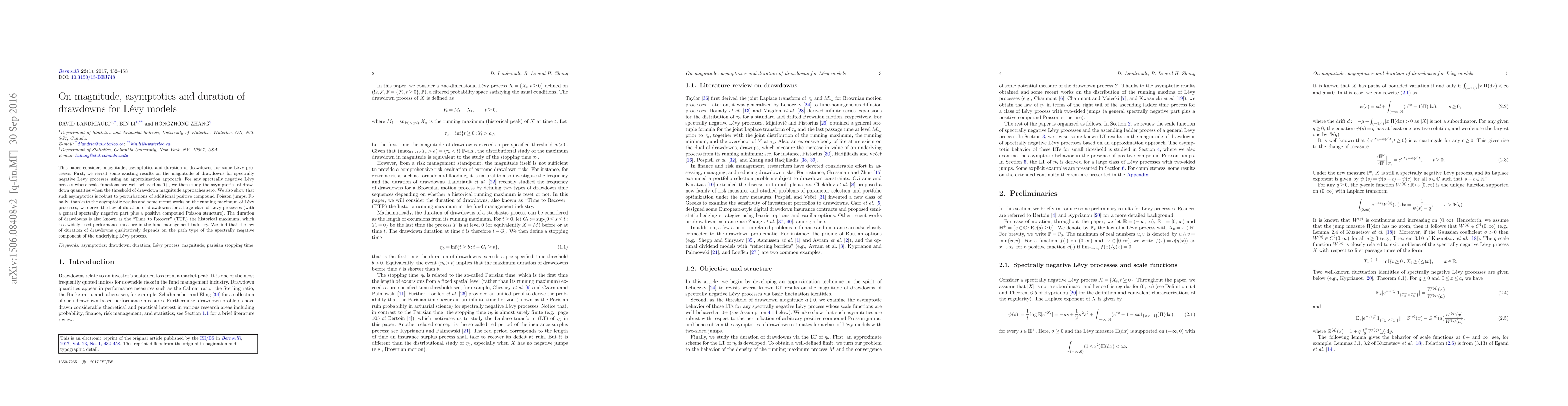 This paper examines the magnitude, asymptotics, and duration of drawdowns for Lévy processes, deriving robust asymptotic results for drawdown magnitudes and establishing the law of duration of drawdowns, which depends on the path type of the underlying Lévy process's spectrally negative component.