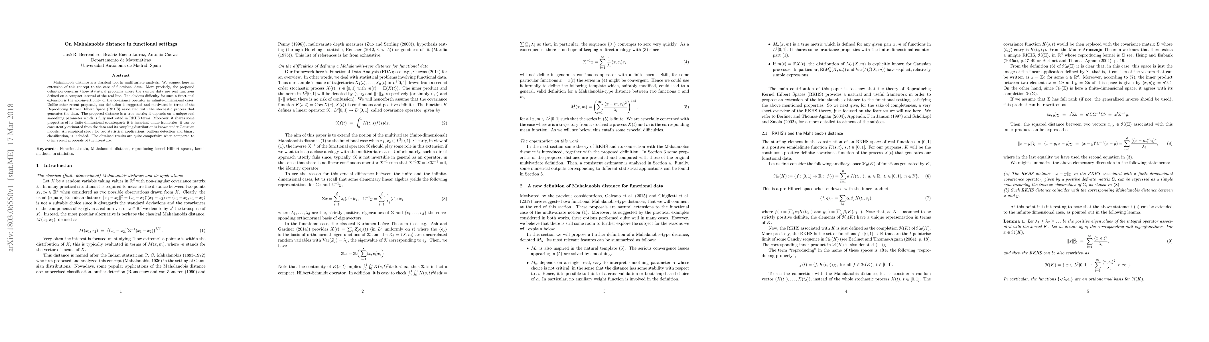 Mahalanobis distance is a classical tool in multivariate analysis. We suggest here an extension of this concept to the case of functional data. More precisely, the proposed definition concerns those statistical problems where the sample data are real functions defined on a compact interval of the real line. The obvious difficulty for such a functional extension is the non-invertibility of the covariance operator in infinite-dimensional cases. Unlike other recent proposals, our definition is suggested and motivated in terms of the Reproducing Kernel Hilbert Space (RKHS) associated with the stochastic process that generates the data. The proposed distance is a true metric; it depends on a unique real smoothing parameter which is fully motivated in RKHS terms. Moreover, it shares some properties of its finite dimensional counterpart: it is invariant under isometries, it can be consistently estimated from the data and its sampling distribution is known under Gaussian models. An empirical study for two statistical applications, outliers detection and binary classification, is included. The obtained results are quite competitive when compared to other recent proposals of the literature.
