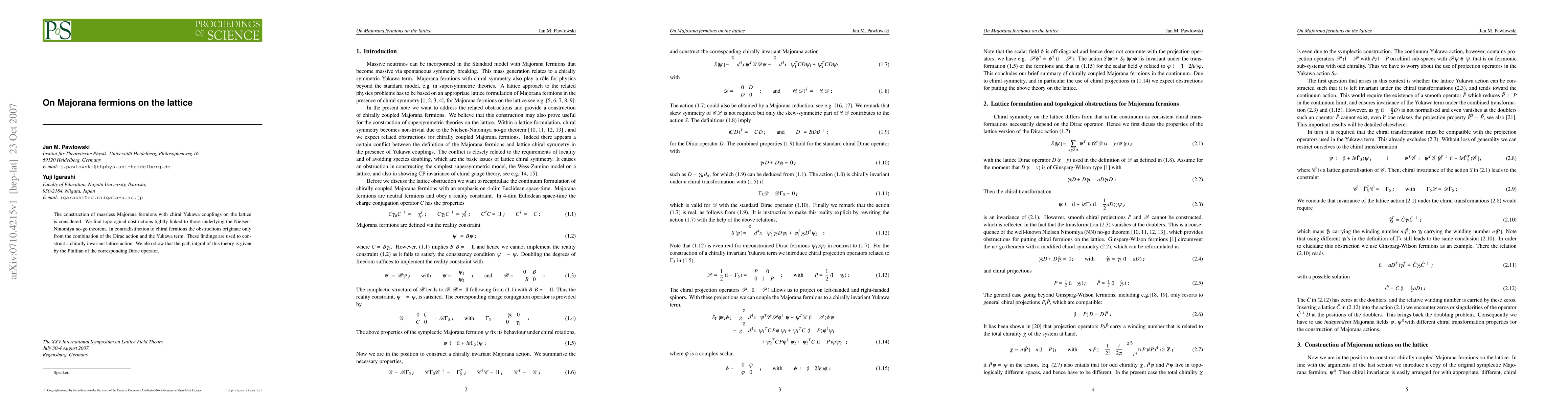 This research constructs massless Majorana fermions with chiral Yukawa couplings on a lattice, revealing topological obstructions related to the Nielsen-Ninomiya no-go theorem. It develops a chirally invariant lattice action and demonstrates that the path integral of this theory corresponds to the Pfaffian of the Dirac operator.