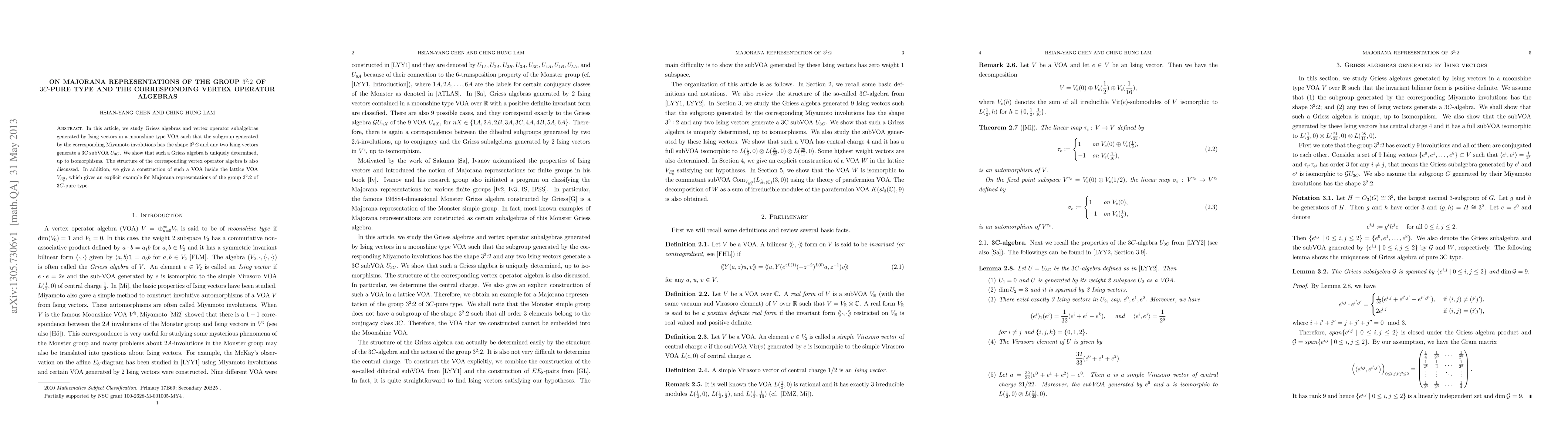 This paper explores the unique determination of Griess algebras and the structure of vertex operator algebras generated by Ising vectors in a moonshine-type VOA, focusing on the subgroup $3^2{:}2$. It also constructs a vertex operator algebra within the lattice VOA $V_{E_8^3}$ to exemplify Majorana representations of the group $3^2{:}2$ of 3C-pure type.