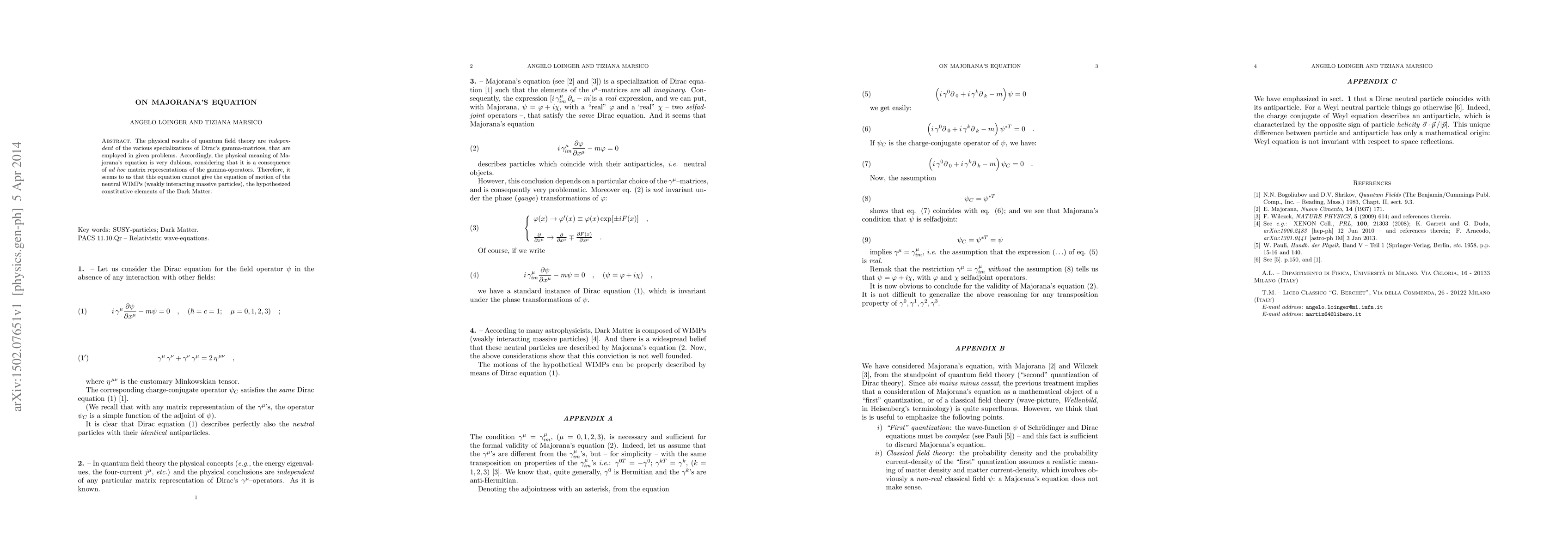 The physical results of quantum field theory are independent of the various specializations of Dirac's gamma-matrices, that are employed in given problems. Accordingly, the physical meaning of Majorana's equation is very dubious,considering that it is a consequence of ad hoc matrix representations of the gamma-operators. Therefore, it seems to us that this equation cannot give the equation of motion of the neutral WIMPs (weakly interacting massive particles), the hypothesized constitutive elements of the Dark Matter.