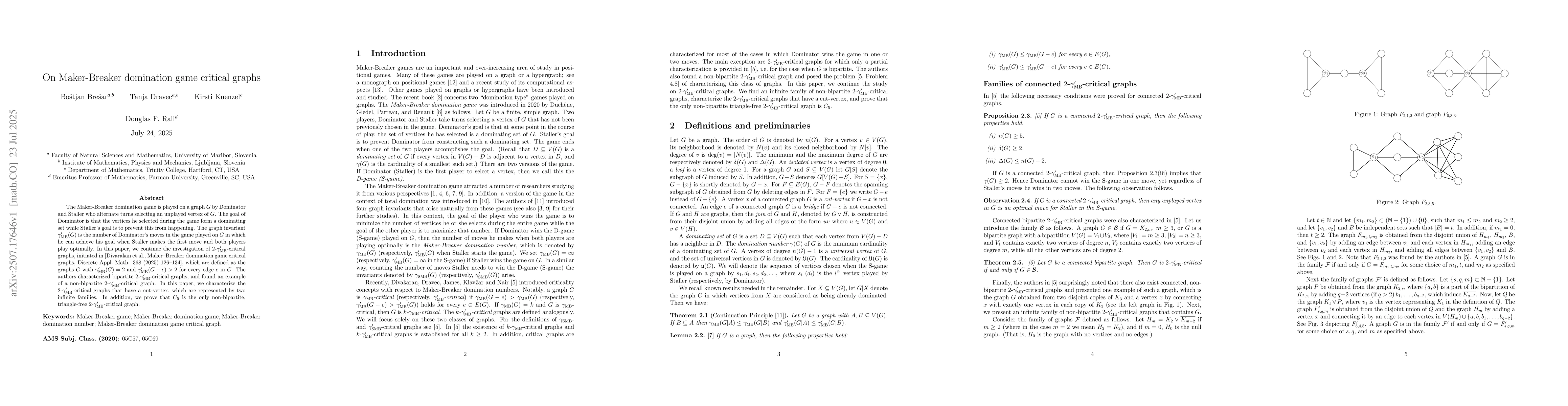 The Maker-Breaker domination game is played on a graph $G$ by Dominator and Staller who alternate turns selecting an unplayed vertex of $G$. The goal of Dominator is that the vertices he selected during the game form a dominating set while Staller's goal is to prevent this from happening. The graph invariant $\gamma_{\rm MB}'(G)$ is the number of Dominator's moves in the game played on $G$ in which he can achieve his goal when Staller makes the first move and both players play optimally. In this paper, we continue the investigation of $2$-$\gamma_{\rm MB}'$-critical graphs, initiated in [Divarakan et al., Maker--Breaker domination game critical graphs, Discrete Appl.\ Math. 368 (2025) 126--134], which are defined as the graphs $G$ with $\gamma_{\rm MB}'(G)=2$ and $\gamma_{\rm MB}'(G-e)>2$ for every edge $e$ in $G$. The authors characterized bipartite $2$-$\gamma_{\rm MB}'$-critical graphs, and found an example of a non-bipartite $2$-$\gamma_{\rm MB}'$-critical graph. In this paper, we characterize the $2$-$\gamma_{\rm MB}'$-critical graphs that have a cut-vertex, which are represented by two infinite families. In addition, we prove that $C_5$ is the only non-bipartite, triangle-free $2$-$\gamma_{\rm MB}'$-critical graph.