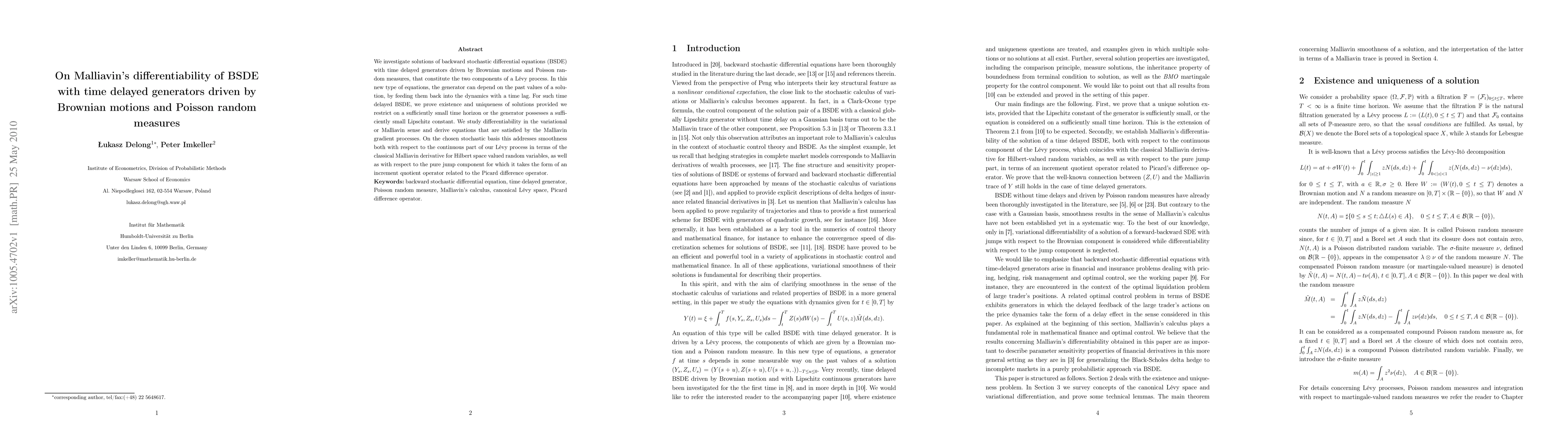 We investigate solutions of backward stochastic differential equations (BSDE) with time delayed generators driven by Brownian motions and Poisson random measures, that constitute the two components of a Levy process. In this new type of equations, the generator can depend on the past values of a solution, by feeding them back into the dynamics with a time lag. For such time delayed BSDE, we prove existence and uniqueness of solutions provided we restrict on a sufficiently small time horizon or the generator possesses a sufficiently small Lipschitz constant. We study differentiability in the variational or Malliavin sense and derive equations that are satisfied by the Malliavin gradient processes. On the chosen stochastic basis this addresses smoothness both with respect to the continuous part of our Levy process in terms of the classical Malliavin derivative for Hilbert space valued random variables, as well as with respect to the pure jump component for which it takes the form of an increment quotient operator related to the Picard difference operator.
