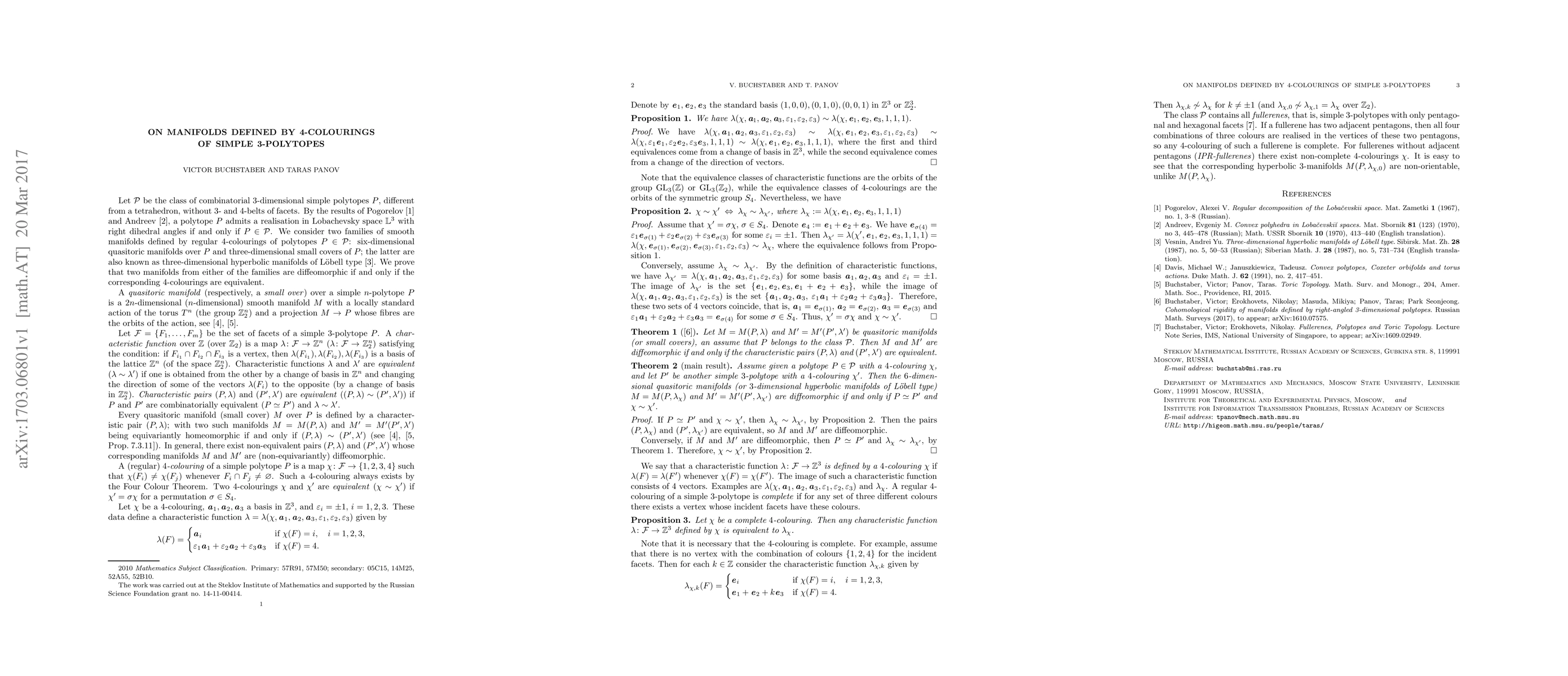 This paper investigates the relationship between combinatorial 3-polytopes in $\mathcal{P}$ and the smooth manifolds defined by their regular 4-colourings. It proves that six-dimensional quasitoric manifolds and three-dimensional Loebell-type manifolds derived from such polytopes are diffeomorphic if their respective 4-colourings are equivalent.