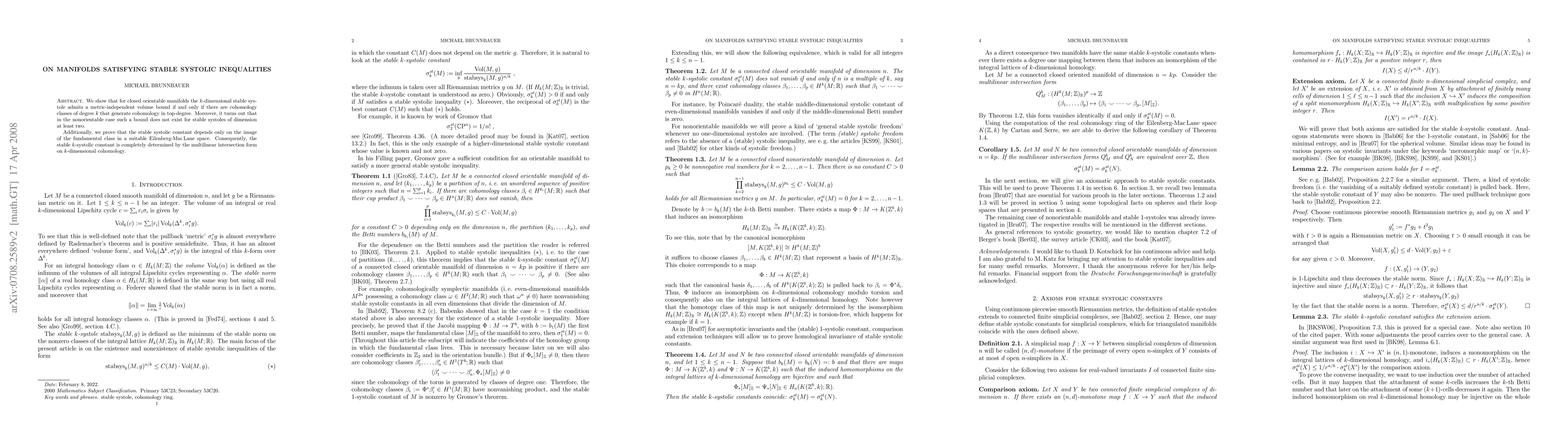 This paper demonstrates that for closed orientable manifolds, the $k$-dimensional stable systole has a metric-independent volume bound if top-degree cohomology is generated by degree $k$ classes. It also proves that no such volume bound exists for nonorientable manifolds for stable systoles of dimension at least two, concluding that the stable systolic constant is determined by the multilinear intersection form on $k$-dimensional cohomology.