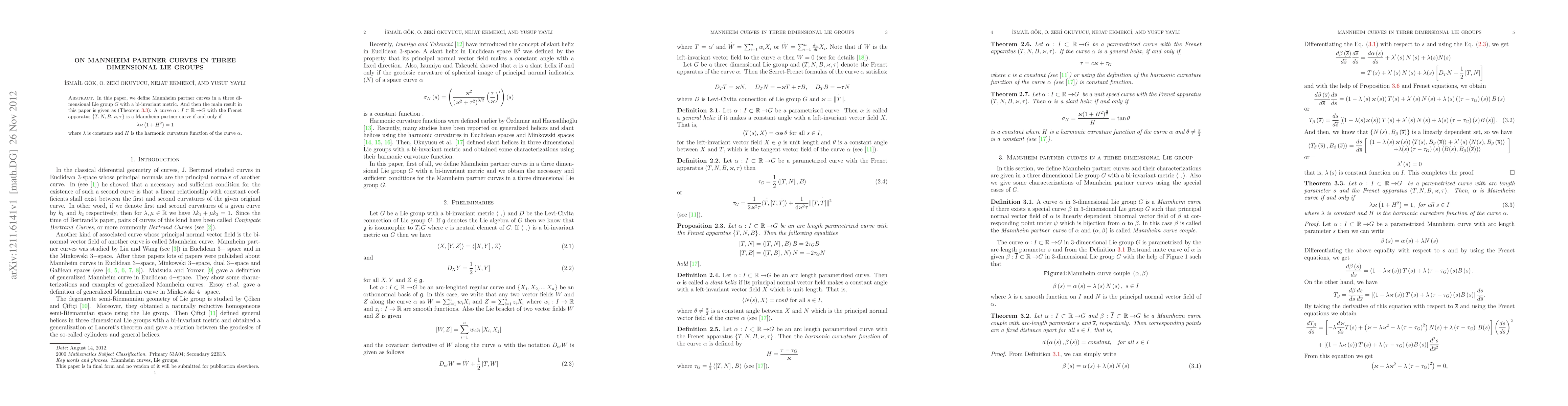 This paper defines Mannheim partner curves in three-dimensional Lie groups equipped with a bi-invariant metric. The key result (Theorem 3.3) establishes that a curve is a Mannheim partner curve if and only if it satisfies the condition λκ(1+H²)=1, where λ is constant and H is the harmonic curvature function.