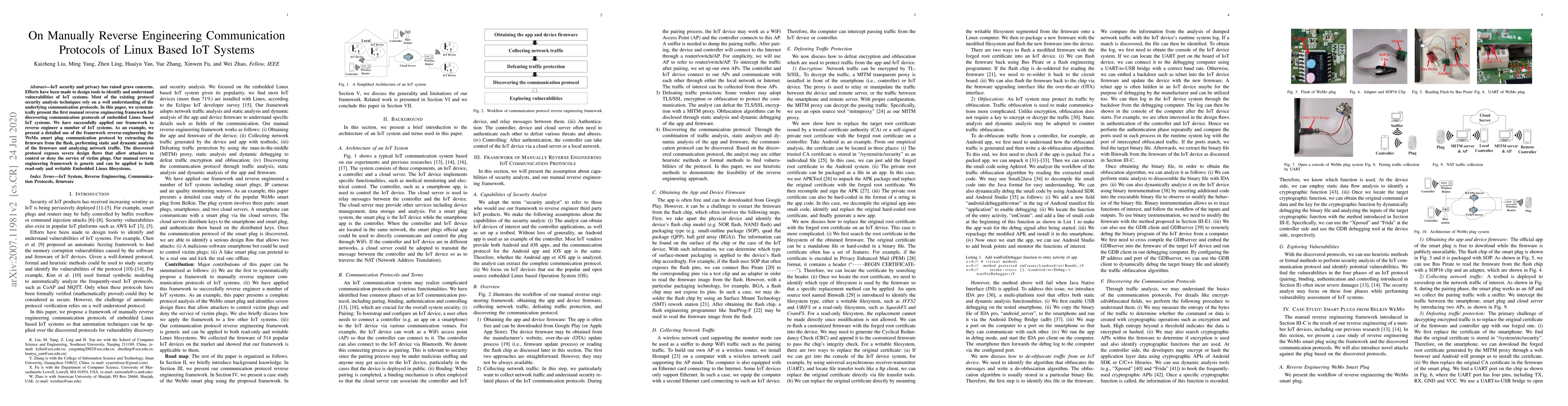 This paper introduces a manual reverse engineering framework for uncovering communication protocols in Linux-based IoT systems, demonstrating its application through the analysis of the WeMo smart plug. The framework extracts firmware, performs static and dynamic analysis, and examines network traffic, revealing significant security flaws in the discovered protocol.