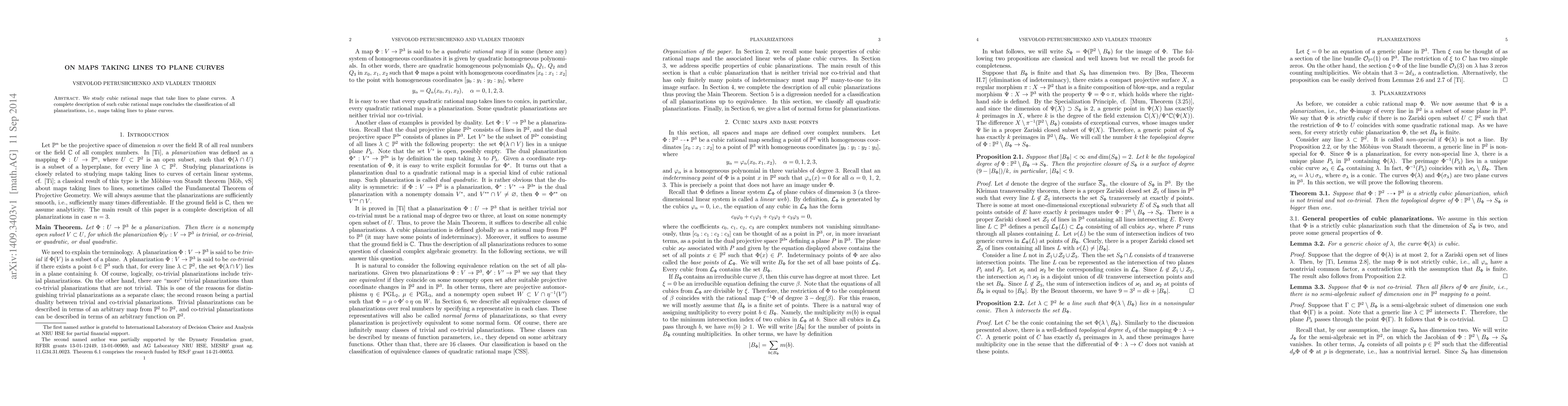 This paper classifies cubic rational maps that transform lines into plane curves, providing a complete description of all planarizations, which are maps taking lines to plane curves. The study concludes the classification of such transformations in the plane.