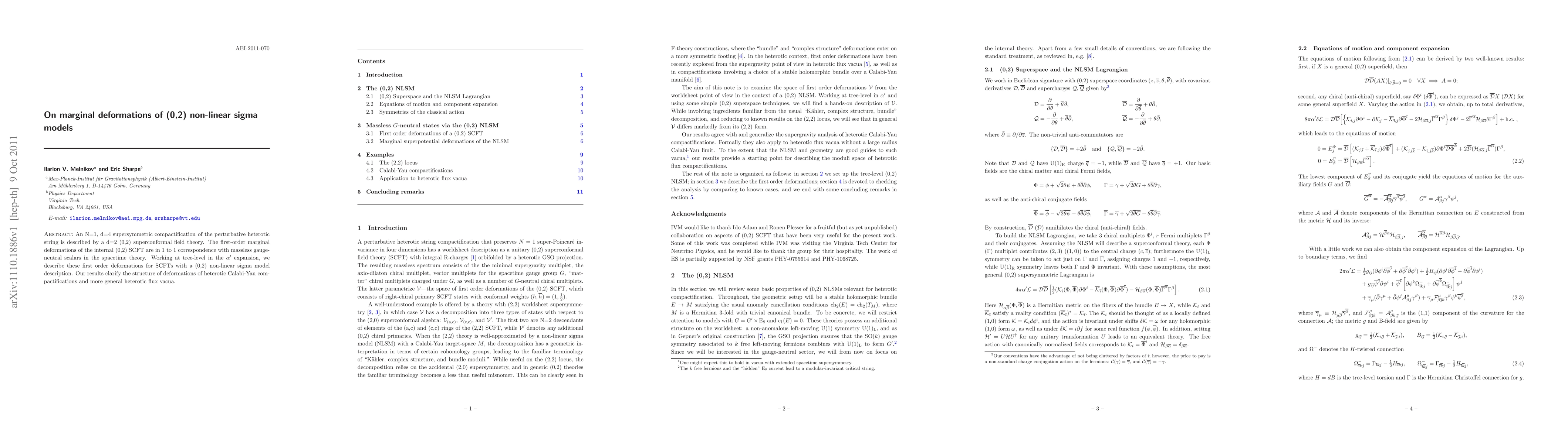 This paper explores the first-order marginal deformations of (0,2) non-linear sigma models in the context of N=1, d=4 supersymmetric compactifications of the heterotic string, clarifying their correspondence with massless gauge-neutral scalars and enhancing understanding of heterotic Calabi-Yau compactifications.