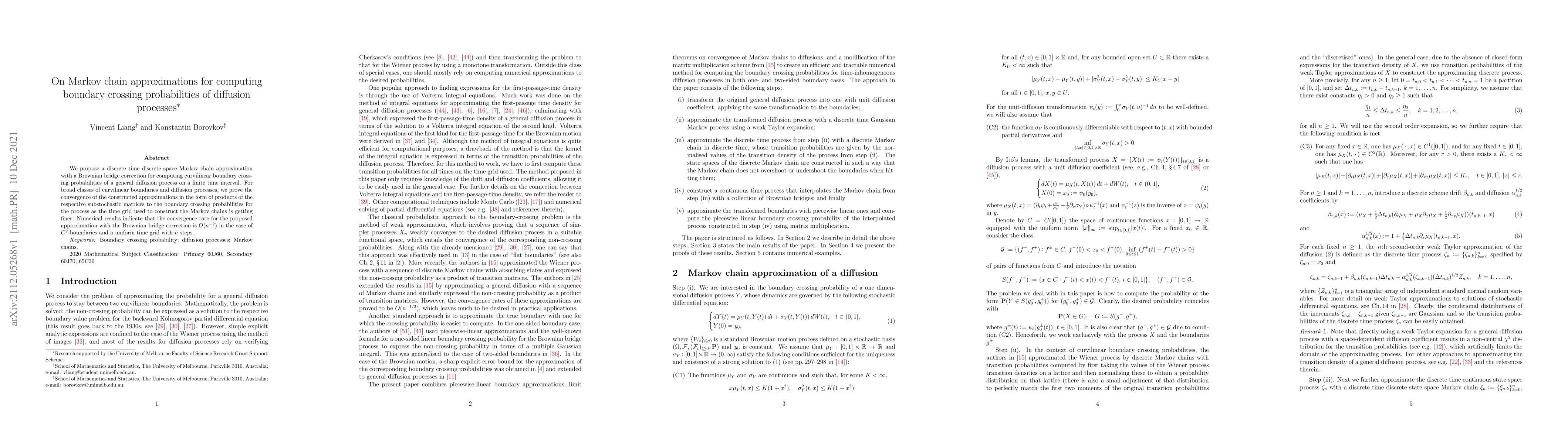 The paper proposes a discrete time discrete space Markov chain approximation with a Brownian bridge correction for computing curvilinear boundary crossing probabilities of diffusion processes.