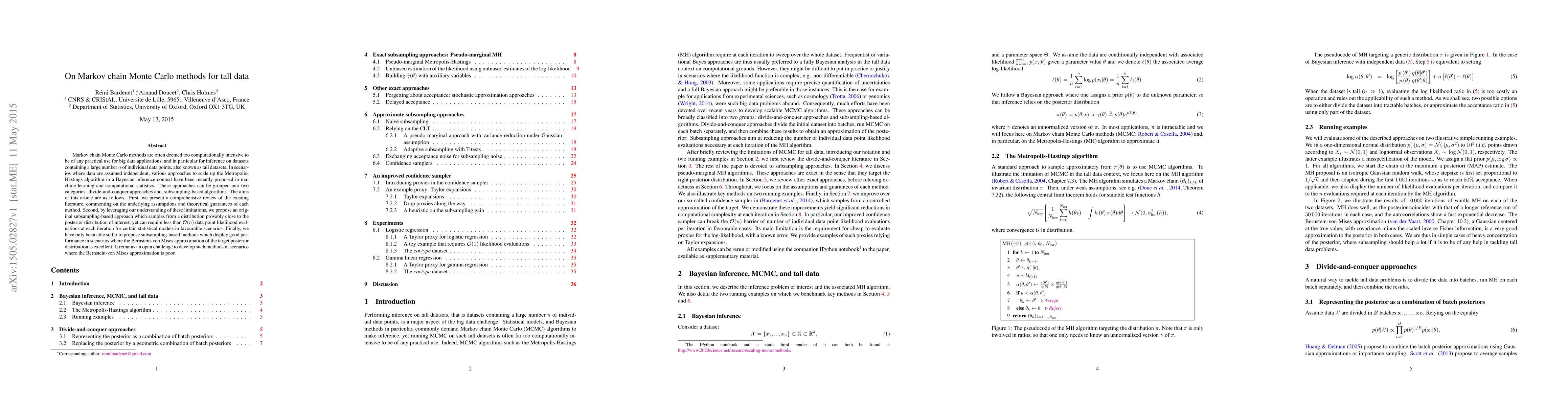 Researchers proposed a new subsampling-based approach for Markov chain Monte Carlo methods to efficiently handle tall datasets, requiring fewer likelihood evaluations than traditional methods in favorable scenarios.