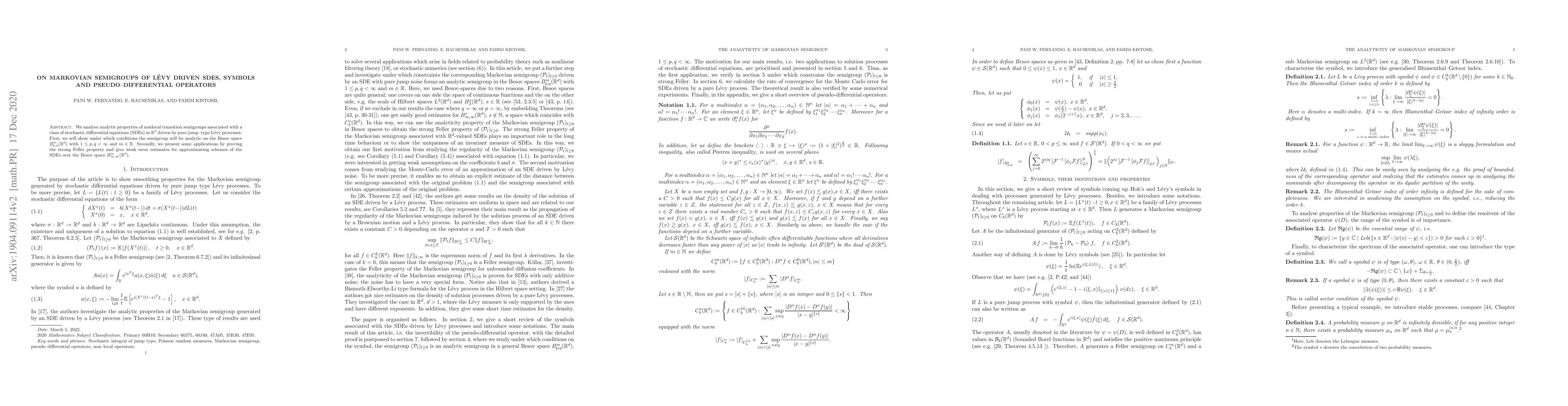 We analyse analytic properties of nonlocal transition semigroups associated with a class of stochastic differential equations (SDEs) in $\mathbb{R}^d$ driven by pure jump--type L\'evy processes. First, we will show under which conditions the semigroup will be analytic on the Besov space $B_{p,q}^ m(\mathbb{R}^d)$ with $1\le p, q<\infty$ and $m\in\mathbb{R}$. Secondly, we present some applications by proving the strong Feller property and give weak error estimates for approximating schemes of the SDEs over the Besov space $B_{\infty,\infty}^ m(\mathbb{R}^d)$.